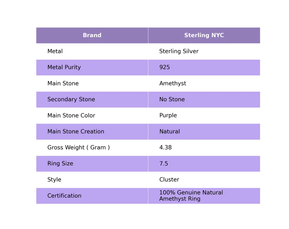 Welcome to Sterling NYC Natural Amethyst Gemstone Cluster Ring Size 7.5 925 Sterling Silver For Women Handmade Ring, Sterling Silver Ring, Amethyst Ring, Handcrafted Ring Specifications:- SKU : JS-60202 Gemstone : Amethyst Stone Shape : As Seen In Picture Metal Purity : 925 Sterling Silver Ring Size : 7.5 US Adjustable : ----------------------------------------------------------------------------------------------------- Experience the timeless allure of silver jewelry, a cherished choice known for its exceptional properties and countless rewards. Explore the captivating charm of its unique attributes, enveloping you with elegance and remarkable healing qualities. Immerse yourself in the enigmatic world of silver, where beauty and benefits harmoniously intertwine. Benefits: Embrace the Elegance : Silver jewelry seamlessly blends accessible luxury with timeless beauty, elevating any jewelry collection without the need for extravagant spending. A Mindful Companion : Adorn yourself with silver jewelry as a gentle nudge towards mindfulness, a tangible reminder to cherish the beauty of every moment. Amplify Positivity : Silver, known for its energy-conducting qualities, is thought to enhance the power of positive intentions and affirmations, aiding in the clear manifestation of your desires. Unleash Self-Expression : Silver jewelry, with its versatile designs, empowers individuals to express their unique style, allowing their personality to shine through every piece. Soothing Serenity : Silver's cooling properties are believed to have a therapeutic effect, bestowing a sense of relief and tranquility upon both body and mind. ----------------------------------------------------------------------------------------------------- For Mother's Day Gift For Father's Day Gift For Promise For Valentine' Day For Halloween Party For Christmas Day Gift For New Year Party For Mom For Her ----------------------------------------------------------------------------------------------------- Discover the impeccable designs tailored just for you, and receive personalized guidance by reaching out to us. Our skilled artisans meticulously handcraft each piece in our workshop, infusing them with love and unwavering attention to detail. Your visit holds immense significance to us, and we are committed to ensuring that your shopping experience is nothing short of exceptional. Thank you for choosing us; we sincerely hope you thoroughly enjoy your shopping journey. Happy shopping! ----------------------------------------------------------------------------------------------------- At SterlingNYC, exquisite craftsmanship meets premium sterling silver gemstone jewelry. Our handcrafted pieces reflect authenticity and uniqueness, a testament to our commitment to excellence. Explore our collection and create your own dazzling jewelry ensemble.