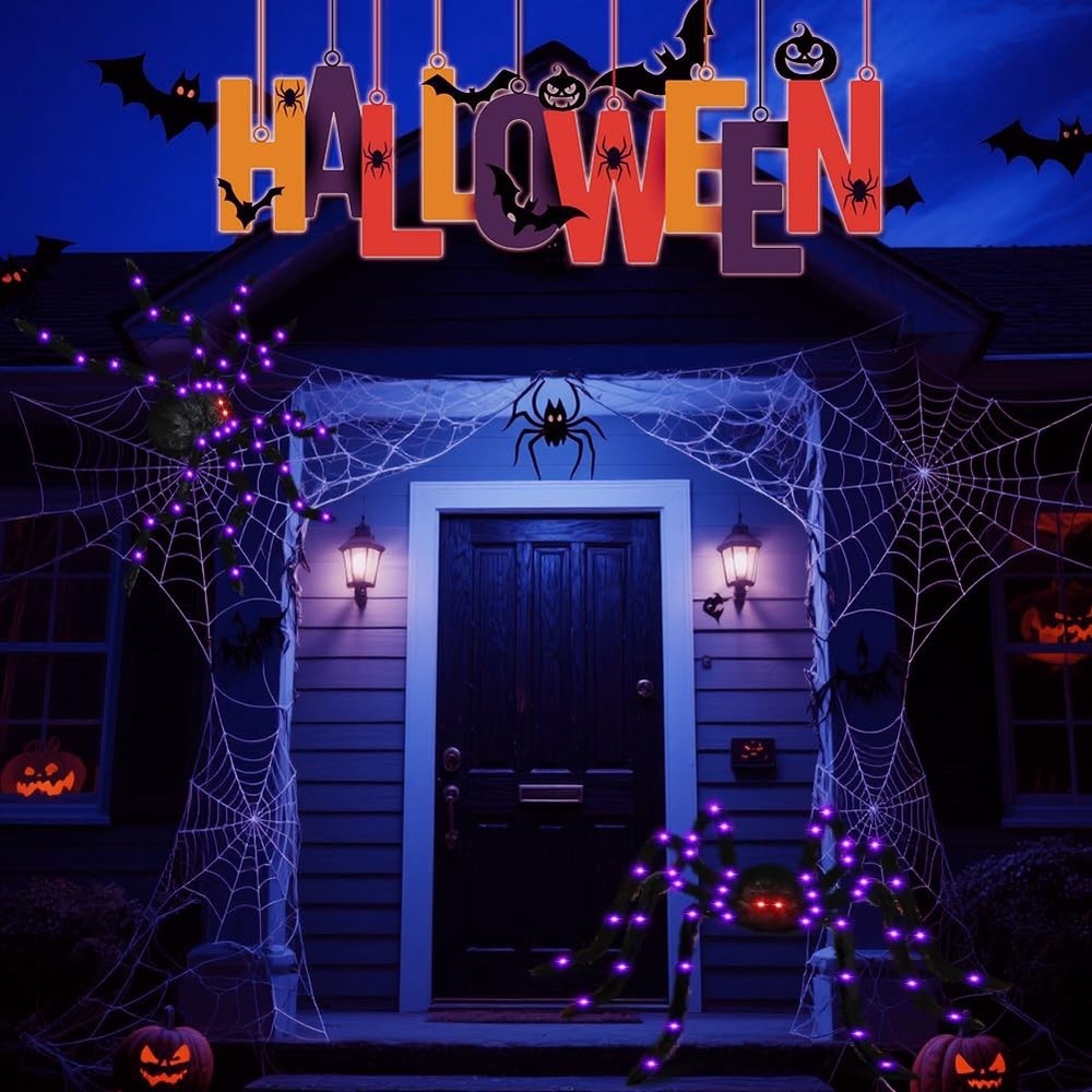 Halloween Decorations Giant Spider Light up Black Hairy Scary Spider with Red Lighted Eyes Battery Operated Fake Spider Party Favor Haunted Yard House Indoor Outdoor Decor 【Realistic and Giant Light-Up Halloween Spider】2 pack 59 in (150 cm) large lighted halloween spider features a realistic black hairy body, each with 36 LED purple lights, and 2 red glowing eyes, perfect for creating a terrifying Halloween atmosphere; 【Battery-Powered with Timer】Requires 3AA batteries (NOT included), 6-hour auto on/18-hour off cycle, making it easy to set up and enjoy with hassle-free Halloween decor; 【Versatile Lighting Modes】Choose from 8 different lighting modes to suit your Halloween decor needs, including steady on, wave, twinkle, and more to create a customized spooky ambiance; 【Flexible and Easy to Store】All legs of the spider are bendable and stretchable, allowing for easy hanging on porches, windows, fences, and more. Easy to fold and store for reuse year after year; 【Indoor and Outdoor Use】Perfect for Halloween decorations both indoors and outdoors, ideal for haunted house props, themed parties, front porches, windows, and more to add a frightful touch to any space; 【Durable and Reusable】Made from high-quality materials, this Halloween spider decoration is built to last for years of scares and thrills, adding fun and fear to your Halloween celebrations.