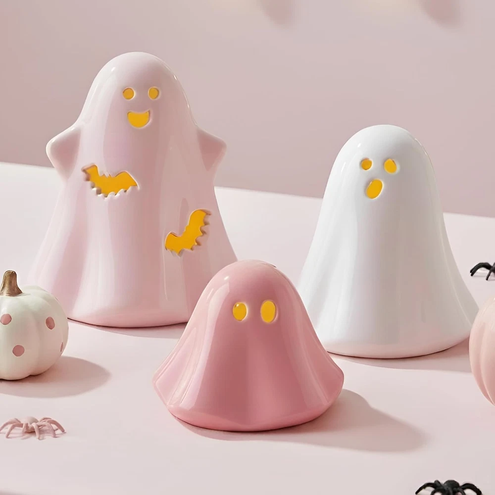 PACKAGE INCLUDES: You will get 3 sets of ceramic Halloween ghost decor with lights (Batteries included). These cute and spooky pink ghosts decorations are ranging from 3.5 to 5 inches tall and can emit yellow lights from inside. Make a fun addition to your Halloween decorations. FANTASTIC DESIGN: These Halloween ghosts statues are hollow and equipped with LED lights inside. The hollow eyes and mouths give them a cute yet spooky ghost look. They will enhance the festive atmosphere of your Halloween decor. HIGH-QUALITY: All ghosts are made of porcelain clay and kiln fired for durability in a glossy pink glaze, sturdy and smooth. Sit firmly on any falt surface without tipping over. Perfect as cute, pastel, preppy Halloween decor. MULTI APPLICATIONS: These lovely little light up ghosts figures are nice and adorable Halloween decor. Suitable for living room, bedroom, kitchen tiered tray decor, table, bar tabletop, mantel, windowsill, bookshelf, desk, TV cabinet, office, classroom and Halloween party supplies. Perfect for the spooky mood. TREASURED GIFTS: With their exquisite craftsmanship and cute design, these ceramic Halloween ghost decor figurines are a nice gift choice. They are sure to pleasantly surprise both children and adults. Suitable for other Halloween party or event decorations. Product description Pink White Cute Ceramic Halloween Ghost Decor Add a whimsical touch to your Halloween decorations with our adorable set of 3 pink and white ceramic ghosts! These charming pieces are designed in a pastel, preppy style that seamlessly blends spooky fun with elegant decor. Perfect for adorning your fireplace mantel, table, desk or office, these cute ghost figurines bring a playful spirit to any indoor setting.