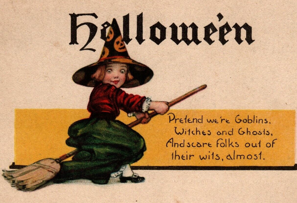This adorable vintage Halloween postcard is a charming find—the little witch on her broom with pumpkins on her hat has so much character! The aged creases and corner dings add to its authentic, nostalgic feel. Perfect for collectors or as a unique holiday gift, especially bundled with others in the shop. Love the Nash Series detail—it’s a spooky-sweet piece of history!
