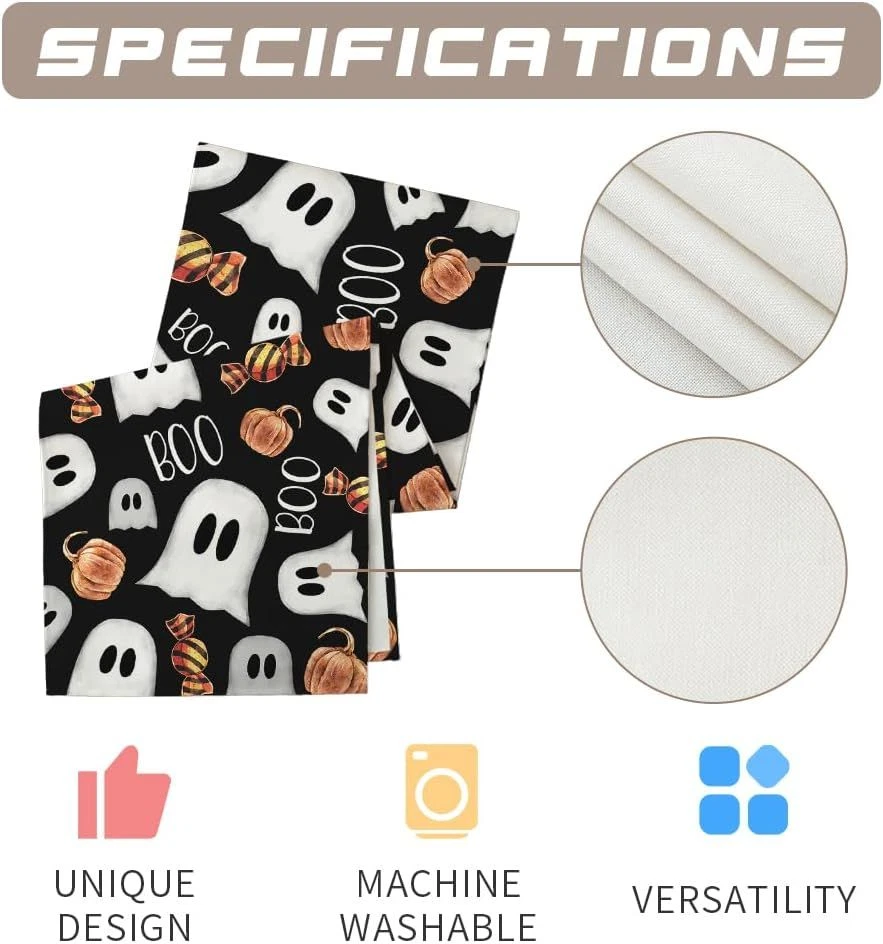 ARKENY Halloween Ghost Table Runner 13x72 - 13"X72", Black Product Details Style: Black Product Care Instructions: Machine Wash Product Dimensions: 72"L x 13"W Manufacturer: ARKENY Item Weight: 4 ounces Country of Origin: China Item model number: AT455-72 Fabric Type: Polyester Assembly required: No Number of pieces: 1 Number of shelves: 1 Batteries required: No Color: Black Material: Polyester Size: Table Runner - 13"X72" Brand: ARKENY Pattern: Ghost Polyester [Perfect Halloween Decoration]:Elevate your dining table with this 13 x 72-inch Halloween table runner, ideal for tables seating 4-8. [High-Quality Material]:Crafted from durable burlap-feel polyester fabric, this Halloween table runner is designed to withstand daily use while maintaining its beautiful appearance. [Vibrant Halloween Colors]:Features spooky, holiday hues of black, perfect for creating a vibrant and inviting atmosphere for Halloween. The rich colors set the stage for a memorable celebration. [Versatile Use]:Ideal for dining tables, mantels, coffee tables, and more, this table runner effortlessly complements any Halloween-themed decor. [Easy Care]:Machine washable for effortless cleaning, this Halloween table runner resists fading to keep colors vibrant season after season.