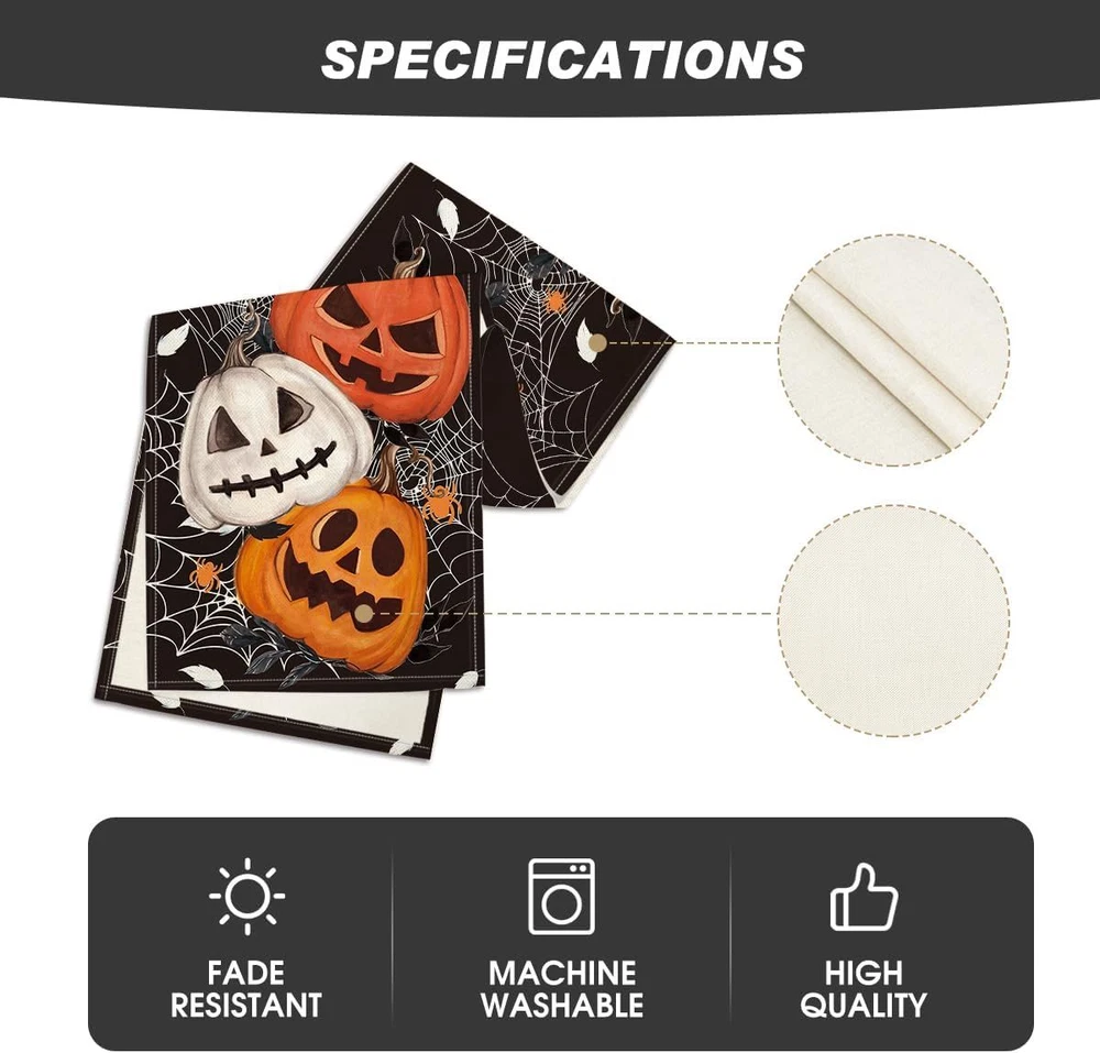 Artoid Mode Black Pumpkins Spider Web 13" x 72", Table Runner, Product Details Style: Rustic Product Care Instructions: Machine Wash Product Dimensions: 72"L x 13"W Manufacturer: Artoid Mode Item Weight: 3.52 ounces Country of Origin: China Item model number: TableRunner Fabric Type: Polyester Number of pieces: 1 Batteries required: No Import: Imported Color: Black Material: Polyester Size: 13" x 72", Table Runner Brand: Artoid Mode Pattern: Web Polyester Imported High Quality & Durable : Made of 100% spun polyester, sturdy sewing, soft and durable, protecting your table's surface from hot pans, scratches, and spills Bright Home Decor : Add flair to your home decor with Artoid Mode colorful table runners. Perfect for kitchen dining daily use themed party decoration, holiday and special events celebration Fits Table Size : This table runner is 13 x 72 inch, appropriate for a table that can seat 4-6 people, better match your table and give you a delightful dining experience Easy to Clean : Machine wash and lay the table runner flat to dry. Stays the same and as new after every wash. Material: 100% Polyester, no shrink, no fading. Imported, Country of origin: China Designed with You in Mind : Artoid Mode table runners are designed by professionals. Vibrant color and unique pattern print offers you creative and unique idea to decorate home