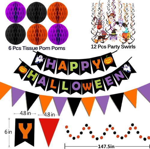 Happy Halloween Banner Paper Triangle Flag Bunting Circle Confetti Dots Hanging Garland Honeycomb Ball Swirl Streamers for Halloween Party Decorations Product Details Occasion: Halloween Cartoon Character: Bird,Cat,Fish,Ghost Pattern: Geometric Shape: honeycomb ball Manufacturer: Fecedy Package Dimensions: 7.95 x 7.48 x 1.61 inches Item Weight: 11.3 ounces Country of Origin: China Is Discontinued By Manufacturer: No Color: Black,orange,purple Material: Paper Included Components: 6pcs Honeycomb Ball, 12pcs paper swirls, 1pcs paper Confetti Circle Garland banner, 1pcs triangle bunting flag, 1 pcs happy halloween banner 6pcs Honeycomb Ball, 12pcs paper swirls, 1pcs paper Confetti Circle Garland banner, 1pcs triangle bunting flag, 1 pcs happy halloween banner6pcs Honeycomb Ball, 12pcs paper swirls, 1pcs paper Confetti Circle Garland banner, 1pcs triangle bunting flag, 1 pcs happy halloween banner See more Brand: FECEDY Theme: Halloween Material:Eco-friendly paper orange purple black fish tail Halloween banner and triangle bunting,hanging honeycomb ball,circle confetti garland banner and swirl streamers. high quality paper material,you can reuse it ! Packaging set : 6pcs Honeycomb Ball;12pcs paper swirls;1pcs paper Confetti Circle Garland banner;1pcs triangle bunting flag.1 pcs happy halloween banner.A big set perfect for your Halloween theme party decoration. Product Size:Each honeycomb Ball dia is 6"; metallic swirls is 31";paper Confetti Circle Garland banner 147.5";triangle bunting flag 6.5feet.they are so easy to hang,perfect for your halloween party decoration. Color: purple,orange,black.design element is halloween pumpkin,goul,bat, cat,bird, ghost,etc...Very cool and Perfect for adding to your party atmosphere.You can take a lot of beautiful pictures with these cute and cool banners decorations. The cute halloween Paper Triangle Flag Banner Confetti Circle Garland Honeycomb Ball Swirl Streamers perfect for your halloween Happy Birthday /thanks giving DAY /Baby Shower/ kids birthday etc...Party Decorations.High quality Brand items from FECEDY! Material:Eco-friendly paper orange purple black fish tail Halloween banner and triangle bunting,hanging honeycomb ball,circle confetti garland banner and swirl streamers. high quality paper material,you can reuse it ! Packaging set : 6pcs Honeycomb Ball;12pcs paper swirls;1pcs paper Confetti Circle Garland banner;1pcs triangle bunting flag.1 pcs happy halloween banner.A big set perfect for your Halloween theme party decoration. Product Size:Each honeycomb Ball dia is 6"; metallic swirls is 31";paper Confetti Circle Garland banner 147.5";triangle bunting flag are so easy to hang,perfect for your halloween party decoration. Color: purple,orange,black.design element is halloween pumpkin,goul,bat, cat,bird, ghost,etc...Very cool and Perfect for adding to your party can take a lot of beautiful pictures with these cute and cool banners decorations. The cute halloween Paper Triangle Flag Banner Confetti Circle Garland Honeycomb Ball Swirl Streamers perfect for your halloween Happy Birthday /thanks giving DAY /Baby Shower/ kids birthday etc...Party quality Brand items from FECEDY!