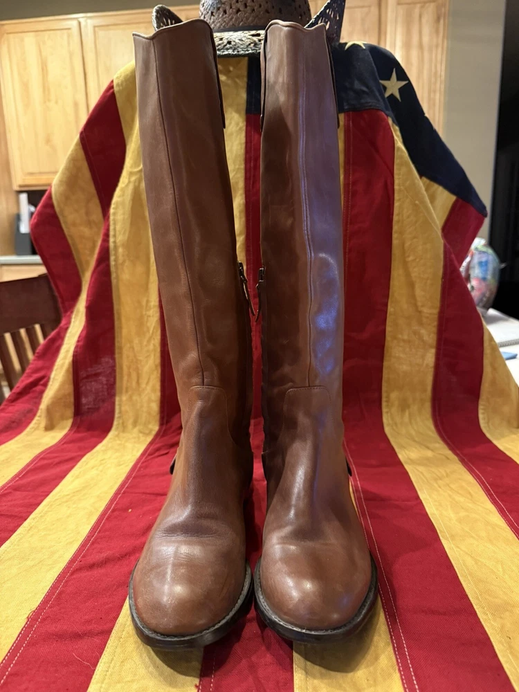 ONLY WORN ONCE Halogen Keri Tall Riding Boots in size 7.5M Versatile and stylish boots suitable for casual, workwear, and business occasions. These knee-high boots feature a round toe shape, a low block heel, and a 1-inch platform height, providing both comfort and style. Made of brown leather, these riding boots have a zip closure for easy wear and a solid pattern that complements the equestrian, cowboy, Southwestern, and cowgirl themes. Perfect for all seasons, these Halogen boots are a chic addition to any wardrobe. ID H7.5Brown1
