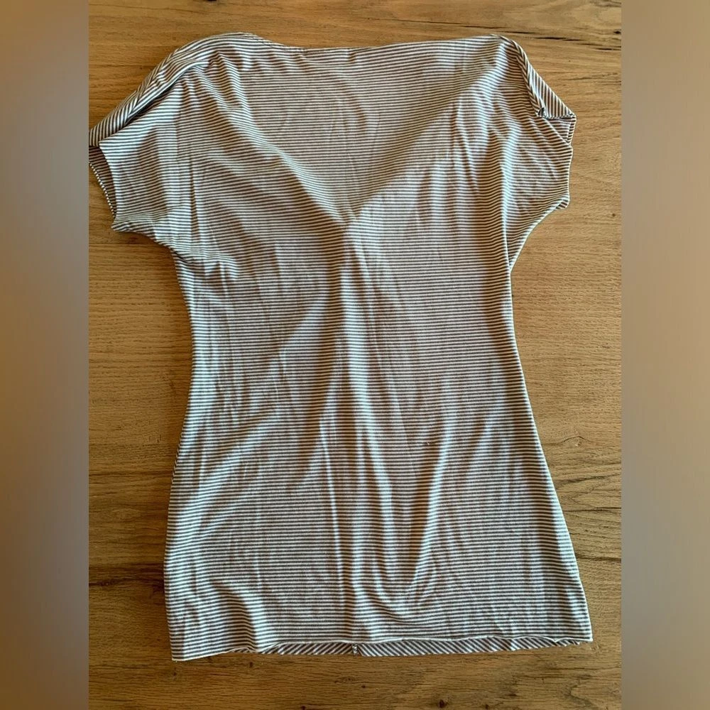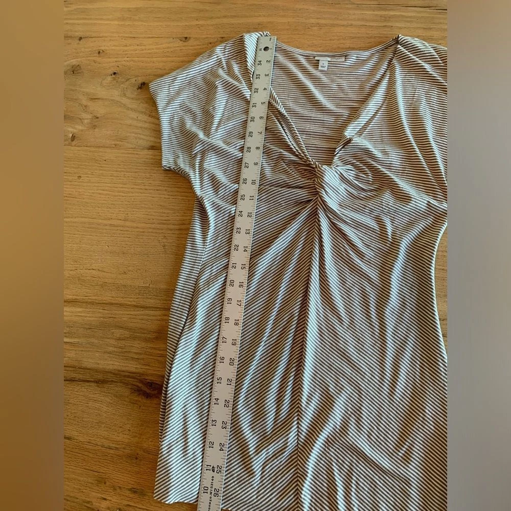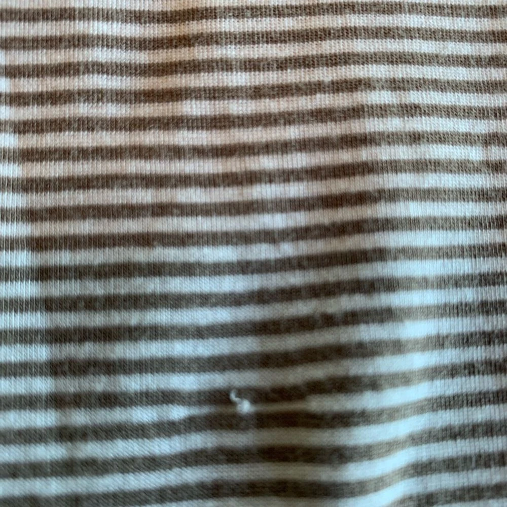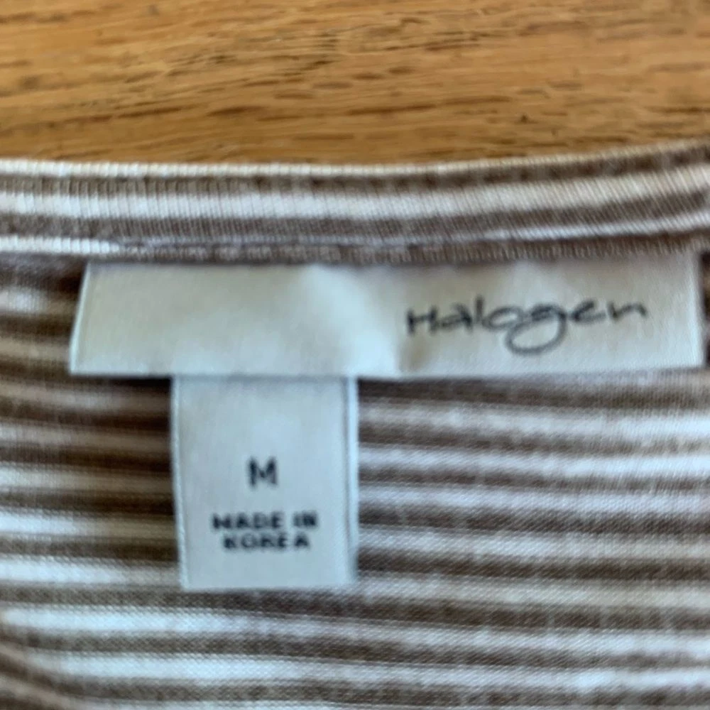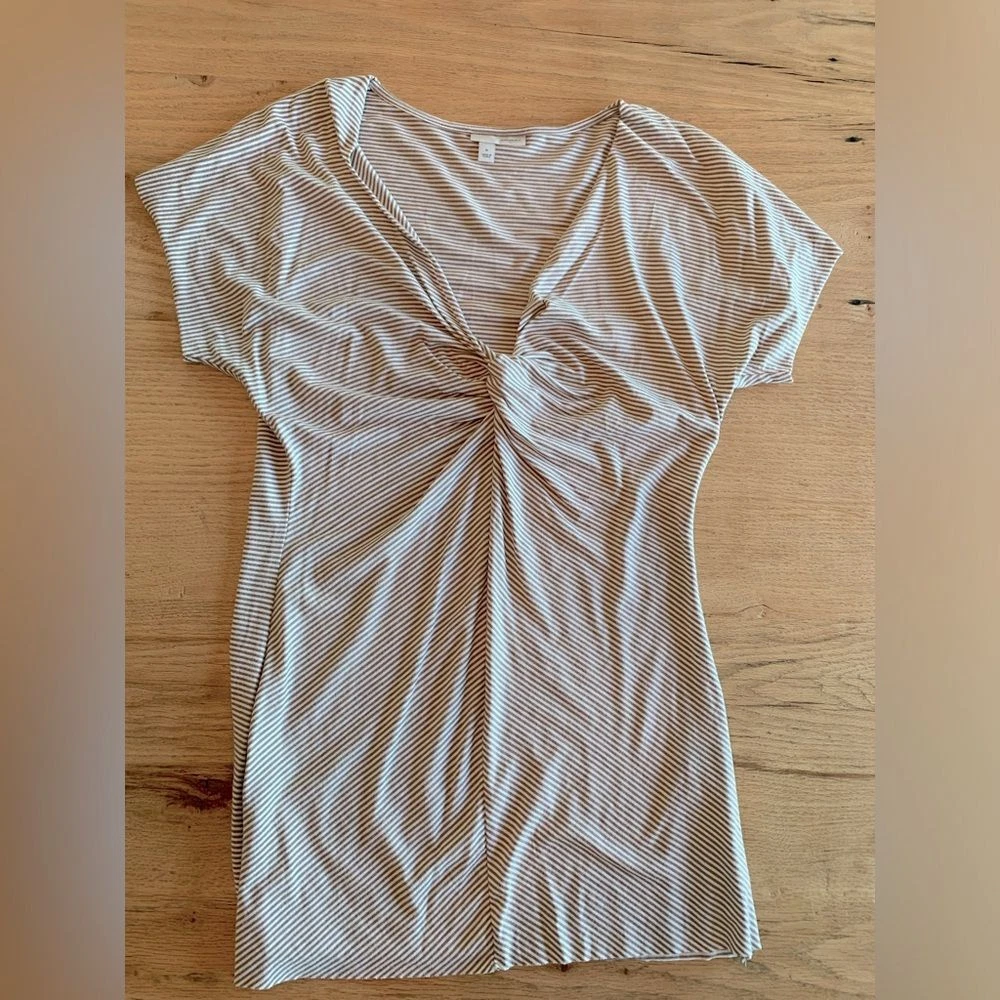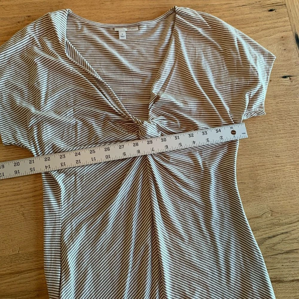 Halogen Stripe Knit Tee Short Sleeve Twisted V Neck Taupe White Women's Size M Preloved Classic Chic Classy Level up Layering Neutral Summer Ships next day from Corvallis Oregon Smoke free environment Flaws shown in pics if any (tiny snag on back)