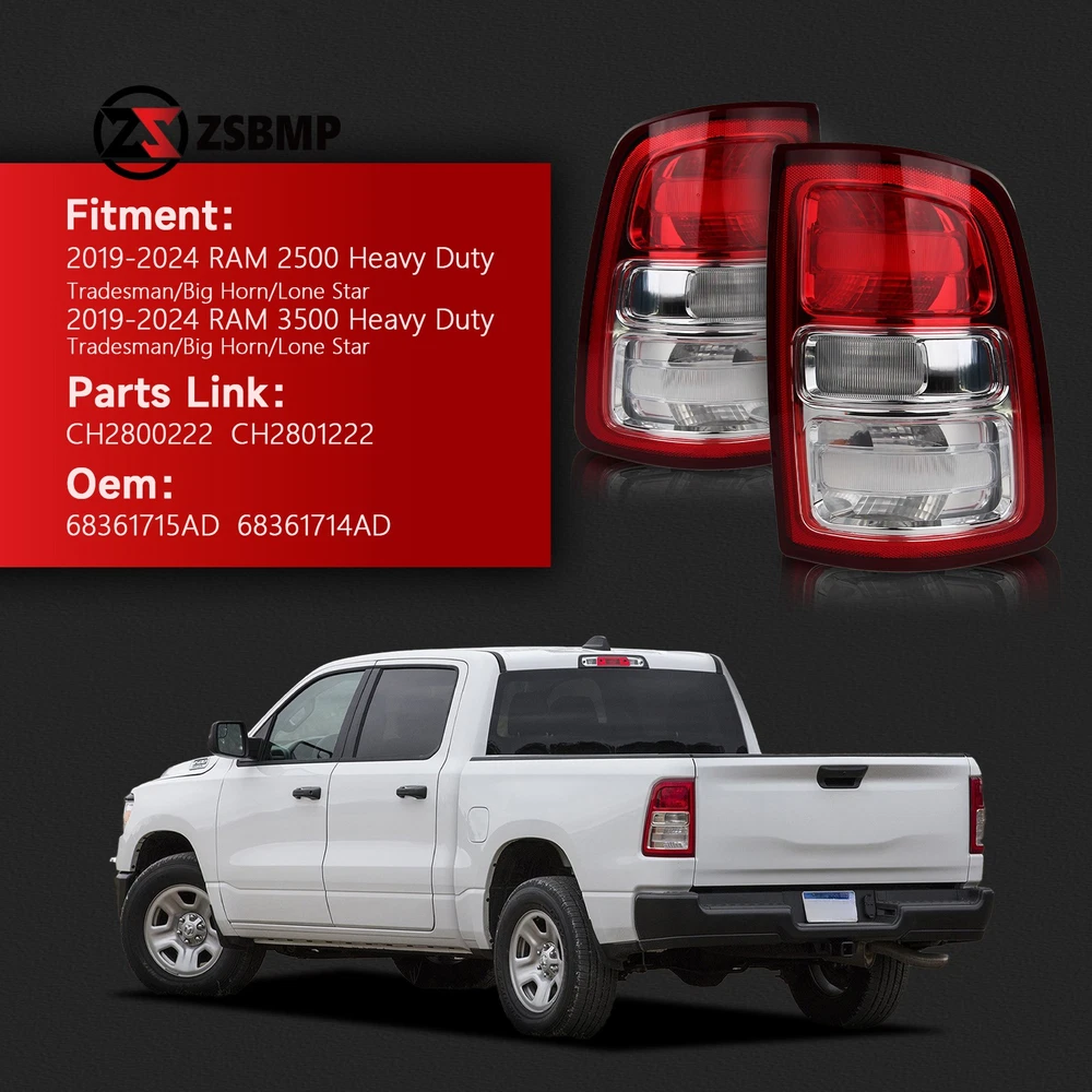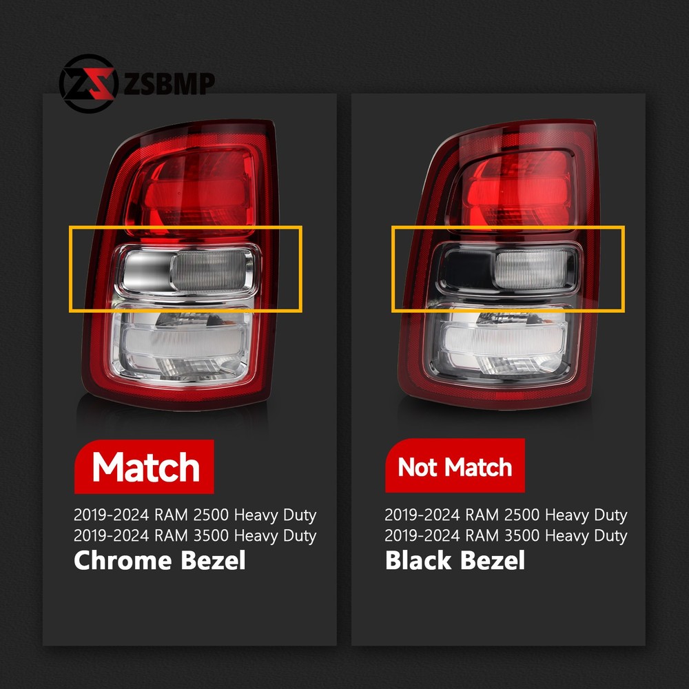 For 2019-2024 RAM 2500 / 3500 Halogen Tail Light Incandescent Chrome Bezel Pair Left Driver + Right Passenger Fitment For 2019 2020 2021 2022 2023 2024 RAM 2500 For 2019 2020 2021 2022 2023 2024 RAM 3500 Attention Compatible w/ Factory Incandescent Tail Light Models Only Not Compatible w/ Factory LED Tail Light Models Description This tail light assembly is a direct replacement for your original tail light, ensuring a perfect fit and easy to install. Providing with bright and clear illumination. This tail light assembly is DOT and SAE certified, meaning it meets or exceeds the standards for quality and safety. Item Specifications OEM: 68361715AD, 68361714AD Condition: 100% Brand New Fits Following: F or RAM 2500 3500_19 20 21 22 23 24 Warranty: 1 Year Bulbs include: Yes Fitment Type: Direct Replacement Lighting Technology: Halogen Material: Plastic Interchange Part Number L : 68361715AA, 68361715AB, 68361715AC, 68707109AA Interchange Part Number R : 68361714AA, 68361714AB, 68361714AC, 68707108AA Package Content 1 Pair Left Driver + Right Passenger Side Tail lights ( OEM: 68361715AD, 68361714AD ) Features Direct Replacement. Perfect fitment. Made of fresh raw plastic particles, got better density consistency and tenacity. Reliable after-sales guarantee. Shipping The Guaranteed Date is automatically generated and displayed by ebay. We can't change it.But we will ship your item out asap after the payment is clear. Usually your Items will be shipped within 1 business day after your payment is cleared. International orders may take 10 to 30 business days to arrive.Thanks for your patience. Return If the package arrives at your location with obvious shipping damage (including broken envelop, empty package and etc), please refuse the shipment. If you find the item is defective after you accept the shipment, please save everything that is attached in the package, including all the documents, and contact us immediately, either through eBay message or email address. You need to state your item ID, item title and what the damage is clearly in your email. And please be advised that digital photos must be attached to the email you send. Notice If you have any questions, please contact to us before leaving bad feedback, we will try our best to solve your problems, thanks for your understanding. On Dec 24, 2025 at 01:31:17 PST, seller added the following information: