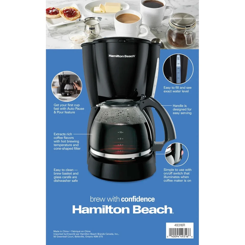 The Hamilton Beach® 12 Cup Coffee Maker extracts coffee's rich flavor with its hot brewing temperature and cone-shaped filter. The cone shape allows water to flow more evenly through ground coffee for great flavor extraction. The coffee maker comes with a sample pack of #4 cone filters. The removable, cone-shaped brew basket and glass carafe are dishwasher safe for easy cleaning, and the nonstick warming plate easily wipes clean. The Auto Pause & Pour feature automatically stops the flow of coffee so you can sneak a cup while the coffee's still brewing without making a mess. The water reservoir has a large easy-view window that lets you see the exact water level from the front of the coffee maker. The durable borosilicate glass carafe has a handle designed for comfortable pouring and measurement markings for accurate filling. The coffee maker is simple to use. Just add coffee, water, and brew with the push of a button to make up to 12 cups of great-tasting, hot coffee at home. The switch has a light that illuminates when the coffee maker is on to remind you to shut it off.