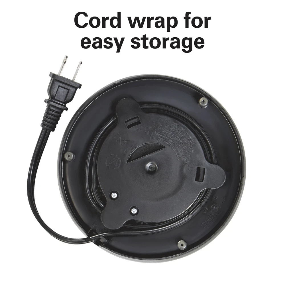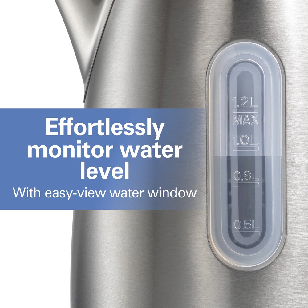 The Hamilton Beach® Stainless Steel Kettle makes it easy to prepare tea, instant coffee, hot cocoa, oatmeal, ramen and more. It has 1500 watts of power for ultra-fast heating, and you can heat 1.2 liters or 5 cups of water faster than a microwave and safer than a stovetop kettle. It's easy to use. Just fill the kettle with water, plug it in and press down the on/off switch near the base. Water heats up quickly and when it reaches a boil, the kettle and indicator light automatically turn off. You can effortlessly monitor the water level with the easy-view water window, and the stainless steel, BPA-free interior provides durability and peace of mind. For cord-free serving, the kettle lifts off the base to let you pour and serve at the table or anywhere you're prepping hot beverages or meals. For easy storage after use, wrap the cord under the base to keep the cord out of the way. Includes a removable mesh filter that helps prevent mineral scale from getting in your cup. ULTRA-FAST HEATING WITH 1500 WATTS: This electric kettle is faster than a microwave and safer than a stovetop kettle. Make a quick cup of tea or instant coffee anytime without the long wait — perfect for hectic mornings or anytime you need hot water fast. AUTO SHUTOFF WITH BOIL-DRY PROTECTION: The automatic shutoff function turns the stainless steel kettle off when water comes to a boil, and the boil-dry protection function keeps the kettle from scorching if the water level gets too low. EFFORTLESSLY MONITOR WATER LEVEL WITH EASY-VIEW WATER WINDOW: With the easy-view window, you'll always know how much water is in the tea kettle or how much water you're adding. The kettle's wide opening makes filling and cleaning easy. SPACE-SAVING COMPACT SIZE IS PERFECT FOR 5 SERVINGS: This compact kettle holds a total of 1.2 liters or 5 cups of water, so it's perfect for preparing up to 5 cups (8 oz. each) of your favorite hot beverages. WIDE OPENING FOR EASY CLEANING: This electric tea kettle's wide opening makes filling and cleaning easy. The stainless steel, BPA-free interior provides durability and peace of mind.