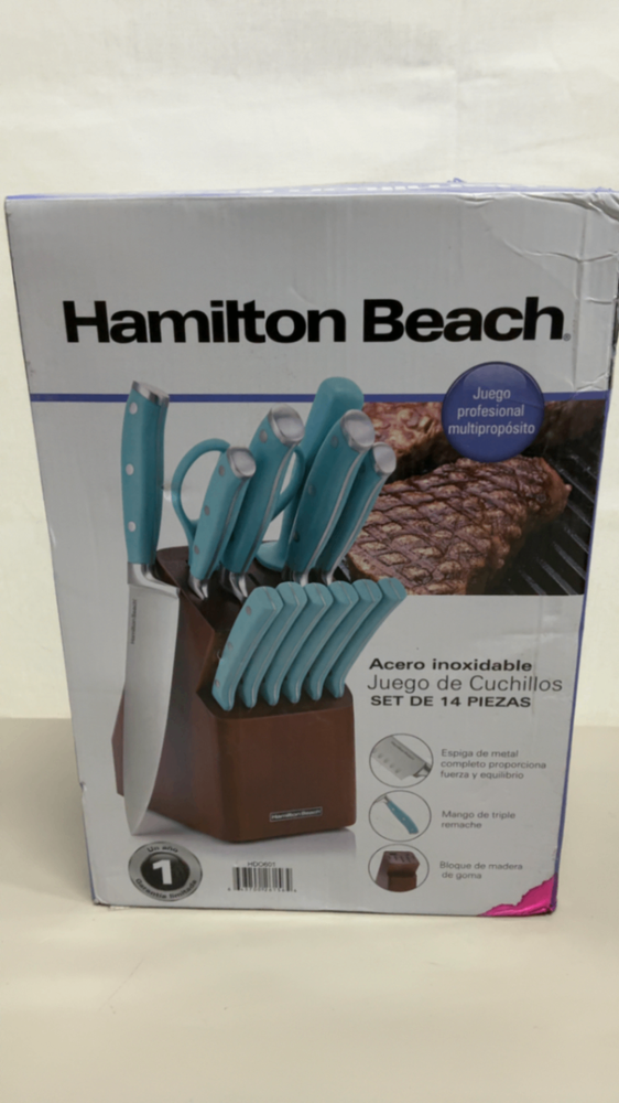 New. Retail box distressed. 14-Piece Hamilton Beach Knife Set includes 8" Chef’s Knife, 7" Santoku Knife, 8" Bread Knife, 5" Serrated Utility knife, (6) 4.5" Steak Knives, 3.5" Paring Knife, Sharpening Steel, Scissors, Hardwood Block. Free shipping applies within the United States only. However orders that are being shipped to Alaska, Puerto Rico, Guam, Virgin Islands, PO/FPO/APO boxes may require an additional fee. Please contact me for a shipping fee before purchasing.