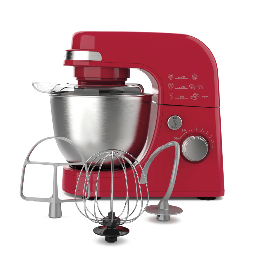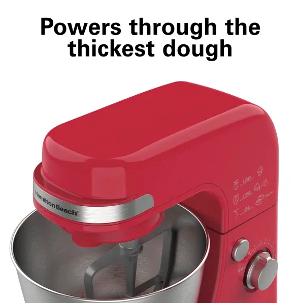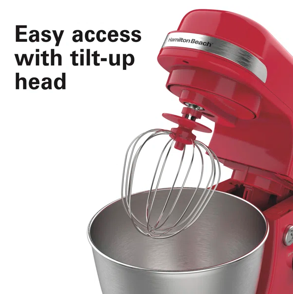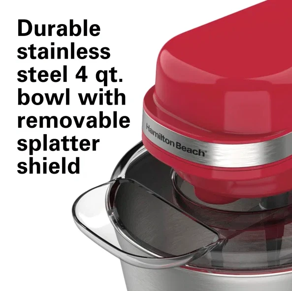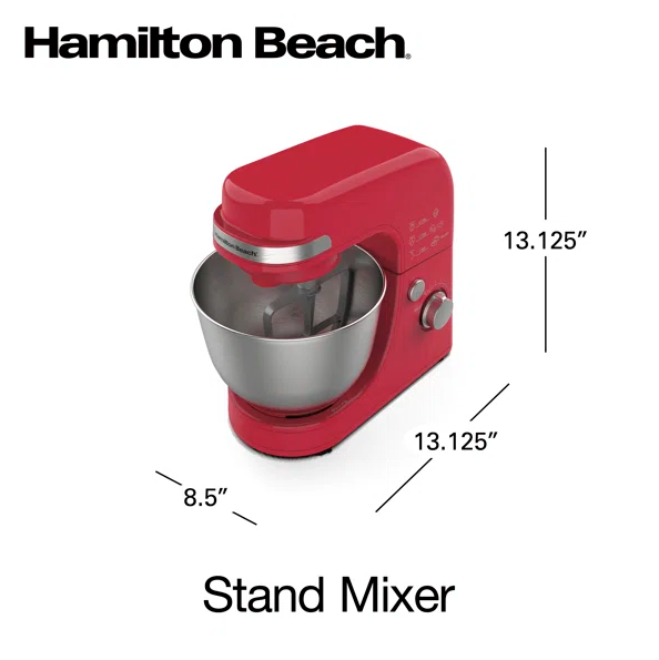 Number of Settings/Programs: 7 Features: Adjustable, Dishwasher-Safe Parts, Speed Setting Power: 300 W Components Included: Mixer, Stand Color: Red Brand: Hamilton Beach Item Weight: 14 lbs Capacity: 4 qt Model: Hamilton Beach ® Power Source: Electric Appliance Uses: Bake, Dough, Whipped Cream Finish: Stainless Steel Material: Stainless Steel Appliance Capabilities: Beat, Blend, Whip