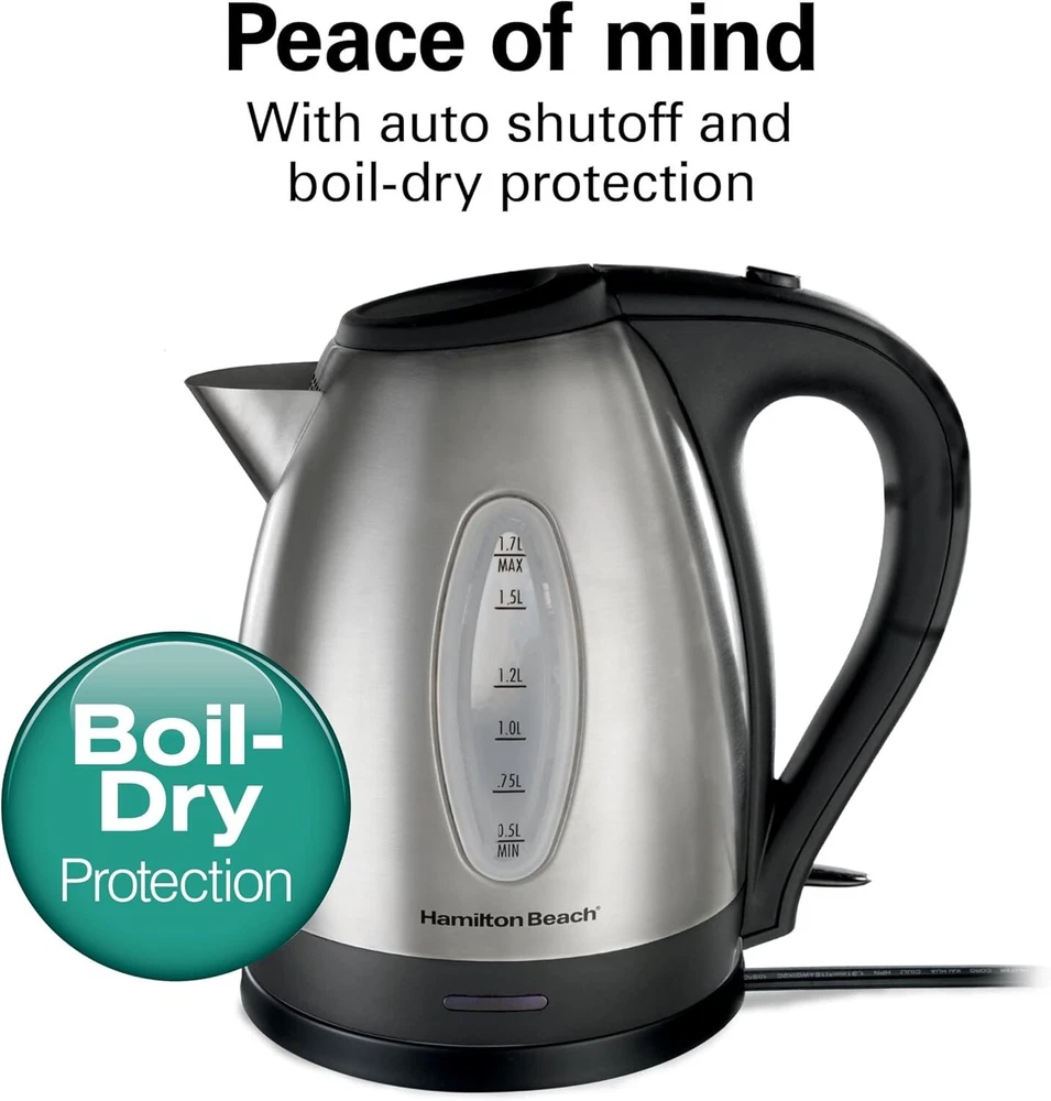 Hamilton Beach Electric Tea Kettle, Water Boiler & Heater, 1.7 Liter, Cordless Serving, 1500 Watts for Fast Boiling, Auto-Shutoff and Boil-Dry Protection, Stainless Steel (40880) FAST BOILING WITH 1500 WATTS: This electric kettle boils up to 1.7 liters of water faster than a microwave and safer than a stovetop kettle. Make a quick cup of tea, coffee and more without the long wait — perfect for hectic mornings. PEACE OF MIND WITH AUTO SHUTOFF: The automatic shutoff feature with boil-dry protection keeps the Hamilton Beach electric kettle from scorching if the water level gets too low. POWER INDICATOR LIGHT AND SIMPLE ON/OFF SWITCH: With an attractive blue power light on the front and a simple on/off switch on the back, this cordless electric kettle lets you easily boil and reheat water without any fuss. DURABLE STAINLESS STEEL WITH BPA-FREE INTERIOR: Designed for years of reliable, worry-free performance and long-lasting style in every kitchen. EFFORTLESSLY MONITOR THE WATER LEVEL: With the easy-to-view water window, you'll always know how much water is in the stainless steel electric kettle or how much water you've added when refilling.