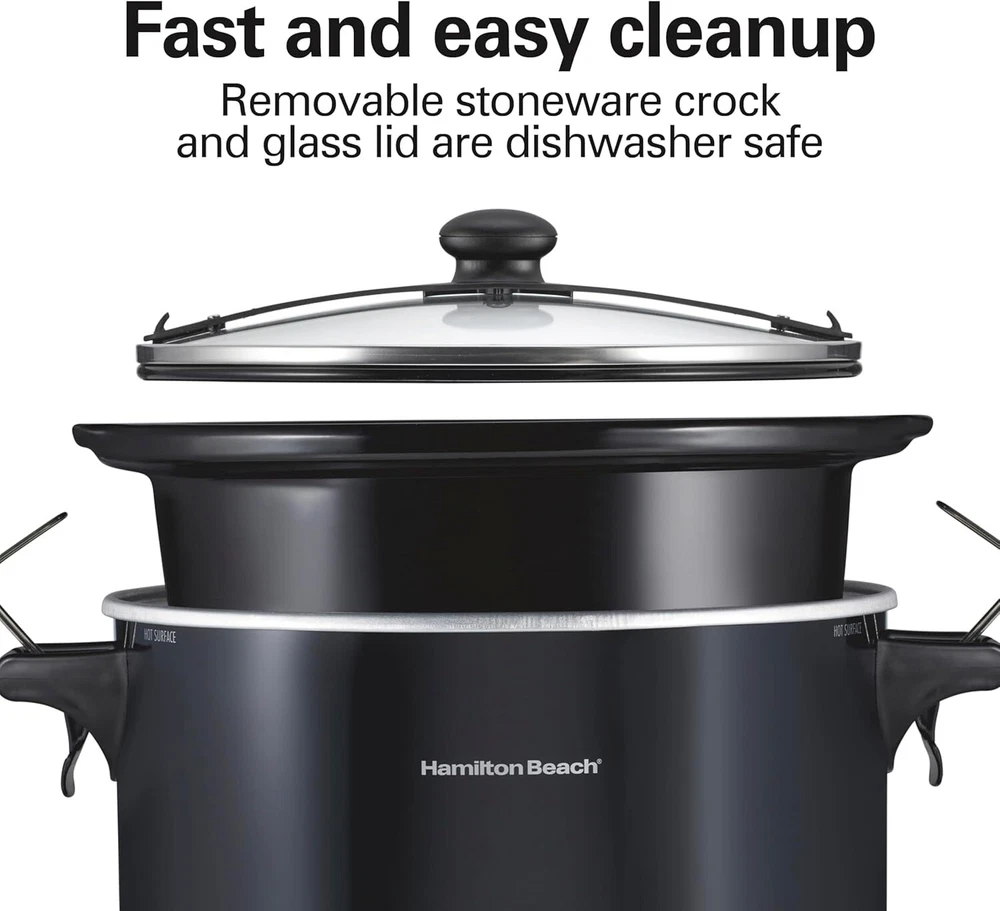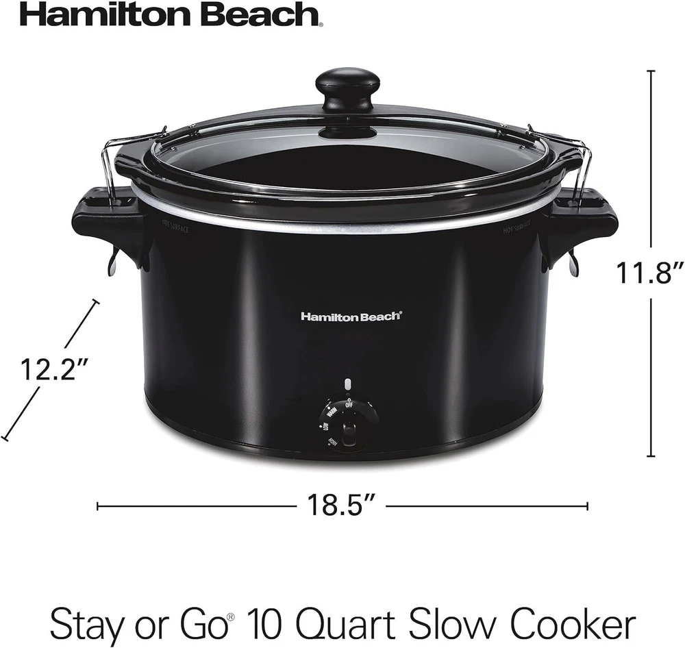 Elevate your meal preparation with the Hamilton Beach Stay or Go Portable Slow Cooker, an extra-large 10-quart appliance designed for the modern kitchen. Crafted with a blend of durable stoneware and a sleek black finish, it's a statement piece that functions just as much as it looks. The glass lid ensures your cooking is transparent, offering a clear view of your dishes' transformation. With three settings/programs, this slow cooker is adaptable to your cooking style and timeline. It boasts a powerful 450W electric power source and features a dishwasher-safe design for effortless cleanup. Measuring 11.5 inches in height and 15.75 inches in width, it's a perfect fit for any kitchen space, and the 120V voltage makes it a practical choice for home use.