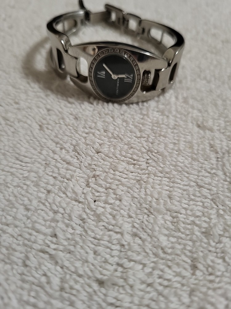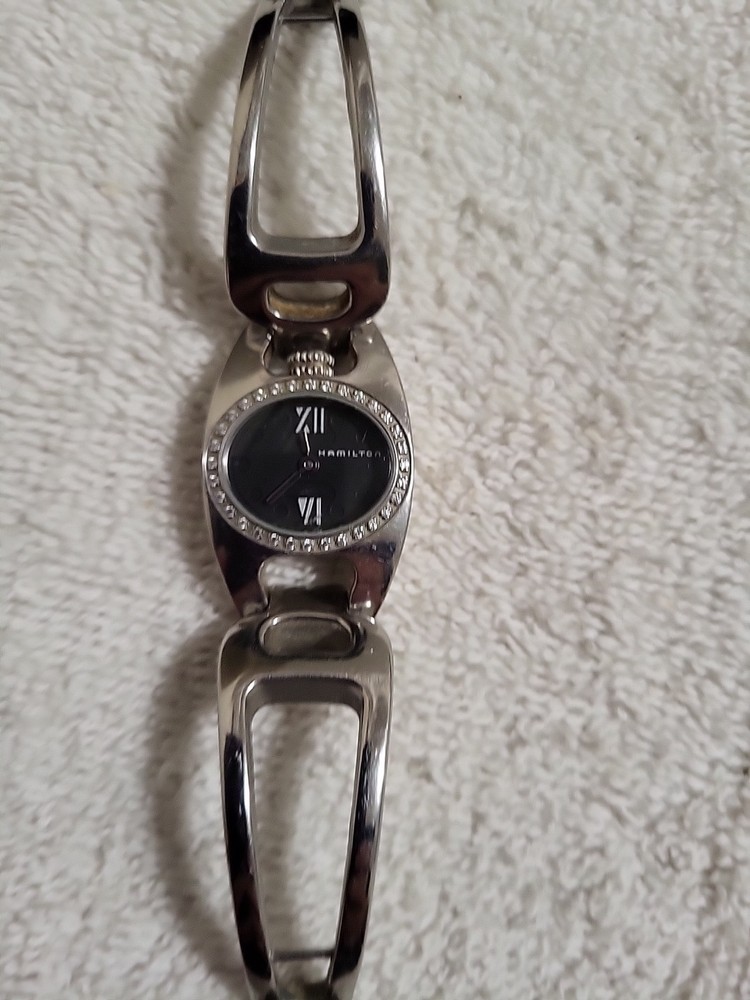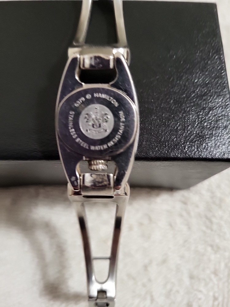 The Hamilton Marilyn 6379 Quartz Watch is a stylish timepiece designed for women, featuring a sleek silver case and diamond bezel. The watch exudes a dressy/formal style, making it perfect for special occasions or everyday wear. With its reliable quartz movement and analog display, this Hamilton watch is both functional and fashionable, making it a great choice for those who appreciate quality and elegance in their accessories. working condition new battery