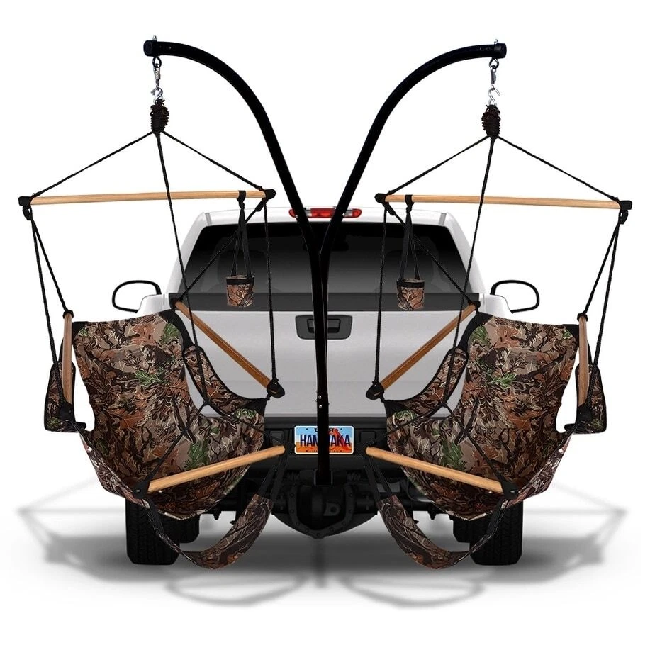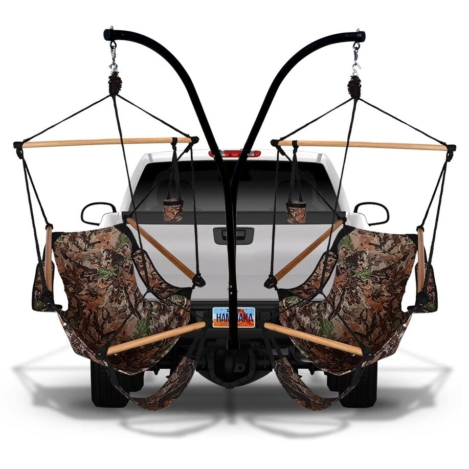 The Hammaka Trailer Hitch and Cradle Chairs sets comes ready to mount on your truck, SUV, or RV so you can relax anywhere you go. This package includes two Hammaka Cradle chairs so you can enjoy all sorts of recreation together. This set is designed to be used tailgating, camping, fishing, or any where your vehicle can go. Free Shipping Over $49.99* Details Hammaka Trailer Hitch Stand with Camo Cradle Chairs Combo Product Description: The Hammaka Trailer Hitch and Cradle Chairs sets comes ready to mount on your truck, SUV, or RV so you can relax anywhere you go. This package includes two Hammaka Cradle chairs so you can enjoy all sorts of recreation together. This set is designed to be used tailgating, camping, fishing, or any where your vehicle can go.