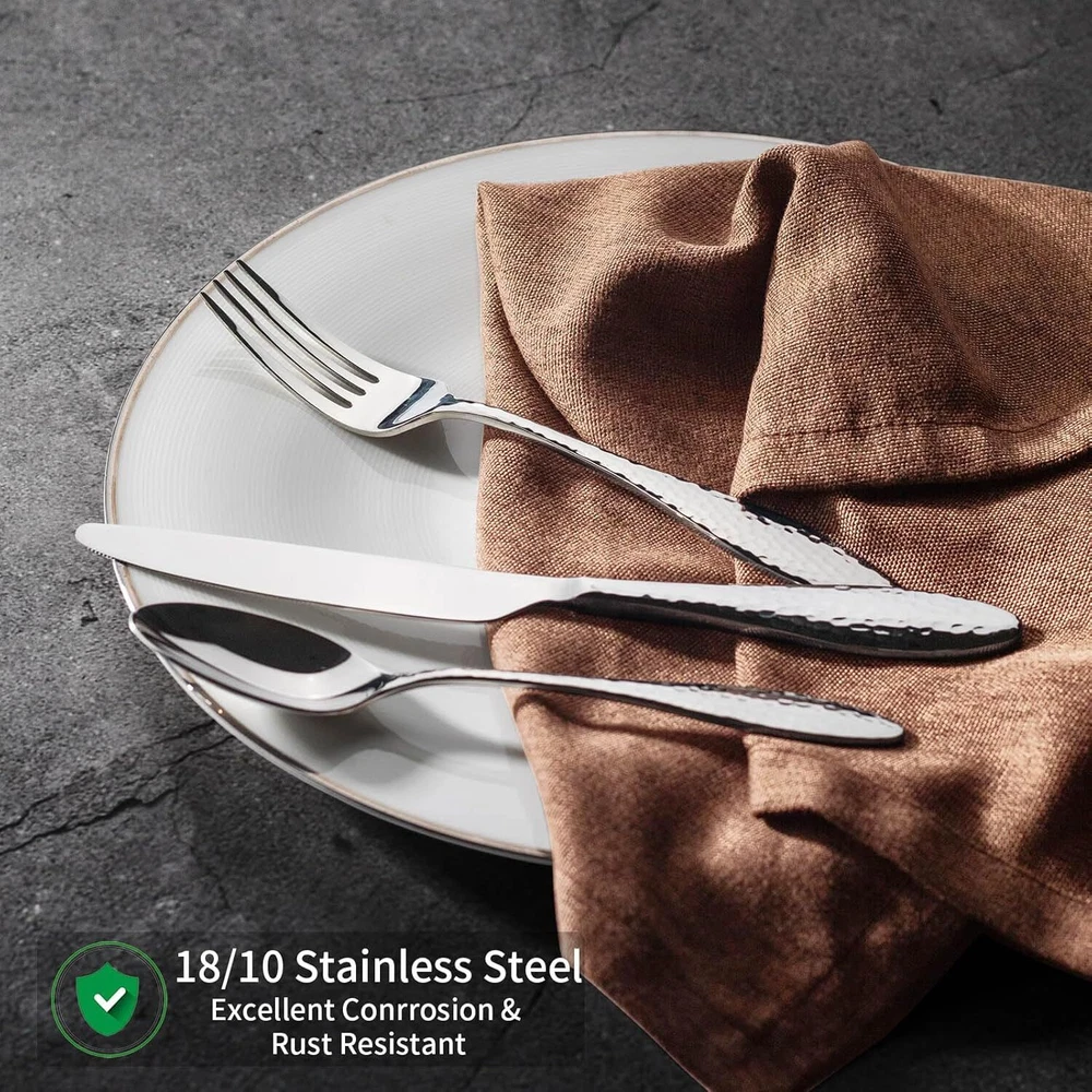 Product Description Emma 40-Piece 18/10 Silverware Set, Hammered Flatware Set, Heavy Duty Stainless Steel Cutlery Set, Modern Kitchen Utensils, Dinnerware Sets Service for 8, Mirror Polished & Dishwasher Safe 18/10 Stainless Steel: The 18/10 material gives this silverware set a more textured texture, and the heavy handle is more sturdy. Don't worry about bending. The curve of the handle conforms to the line of the hand, making this cutlery set more comfortable to hold when using Hammered Patterns: The handles of this spoon and fork silverware set have a beautiful hammer pattern, which is hand-hammered by artisans. The unique irregular pattern will bring you a different dining experience Flatware Set For 8: Set includes 8 each: dinner knife, dinner fork, salad fork, dinner spoon and teaspoon. This silverware set is great for daily use. Works well with modern and traditional table settings and complements any stemware of dinnerware Multiple Occasion: The cutlery set not only for daily use, but also for party, holiday, wedding, gathering and camping, or for buffets and banquets at restaurants and hotels. It's also a wonderful choice as a gift for your friends or lover Warm Tips: Mirror flatware never needs polishing. Hand wash recommended, dry them before storing to prevent water spots or potential corrosion. Do not use steel wire brush, hard sponge,cleaning cloth or any other hard-material cleaning tools for cleaning to avoid damage to the silverware About Us We are a reputable seller with many years of experience selling on eBay. Our goal is to provide high-quality products and excellent customer service. Payment 1.We accept PayPal only. 2.All major credit cards are accepted through secure payment processor PayPal. 3.Payment must be received within 7 business days of auction closing. 4.We ship to your eBay or Paypal address. Please make sure your eBay and Paypal address is correct before you pay. Feedback will be left automatically after we receive your feedback. Please contact us before leaving a Negative feedback or Neutral feedback. We would try our best to help you solving any problem. Shipping Items will be shipped within 1-3 business days when we received payment. (Orders are not processed on weekends & holidays) Tracking information will be sent once item is shipped. Delivery time depends on destination and other factors Item is shipped to ebay address. Leaving correct address can minimize delay. For international shipping and shipping to Guam, Hawaii and Alaska, Please contact us before placing the order. International buyers please note: Import duties, taxes and charges are not included in the item price or shipping charges. These charges are buyer’s responsibility. We will try our best to reduce the risk of the custom duties. Local pick-up is unavailable at the moment. Returns For any issues with Defects, Return, Item Exchange request, please contact us first and send us a message first before opening any type of case or request. We devote ourselves making EVERY CUSTOMER in 100% Satisfactory and resolve any problem. We highly value and appreciate your business. Thank you. No returns will be accepted without an RMA number. Please contact us for the RMA number. Return is acceptable within 30 days of delivery. Return for replacement or money back is optional. Returned items must be in the brand new, unaltered and resalable condition. Seller is not responsible for any labor cost, expense in a dealer store, or damage due to wrong installation. Contact Us We reply any email messages within 1 business / working days(off-duty at weekend). If you do not get a response from us, then please check your junk or spam mailbox. Our Business hours: Mon-Fri 9:00-18:00, UTC/GMT +8 hours. Please contact us either by clicking "contact seller" in the "purchase history" section or simply click "ask a question" at the bottom of this page. If you are unsatisfied with our item or service, please contact us before leaving any feedback. We are committed to resolve all issues in a friendly and satisfactory manner. powered by