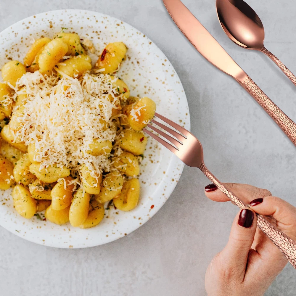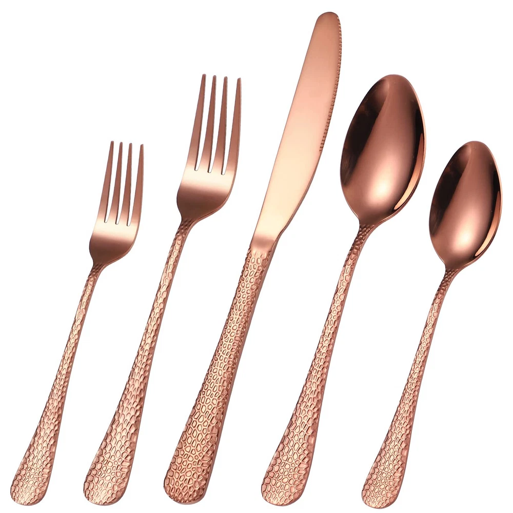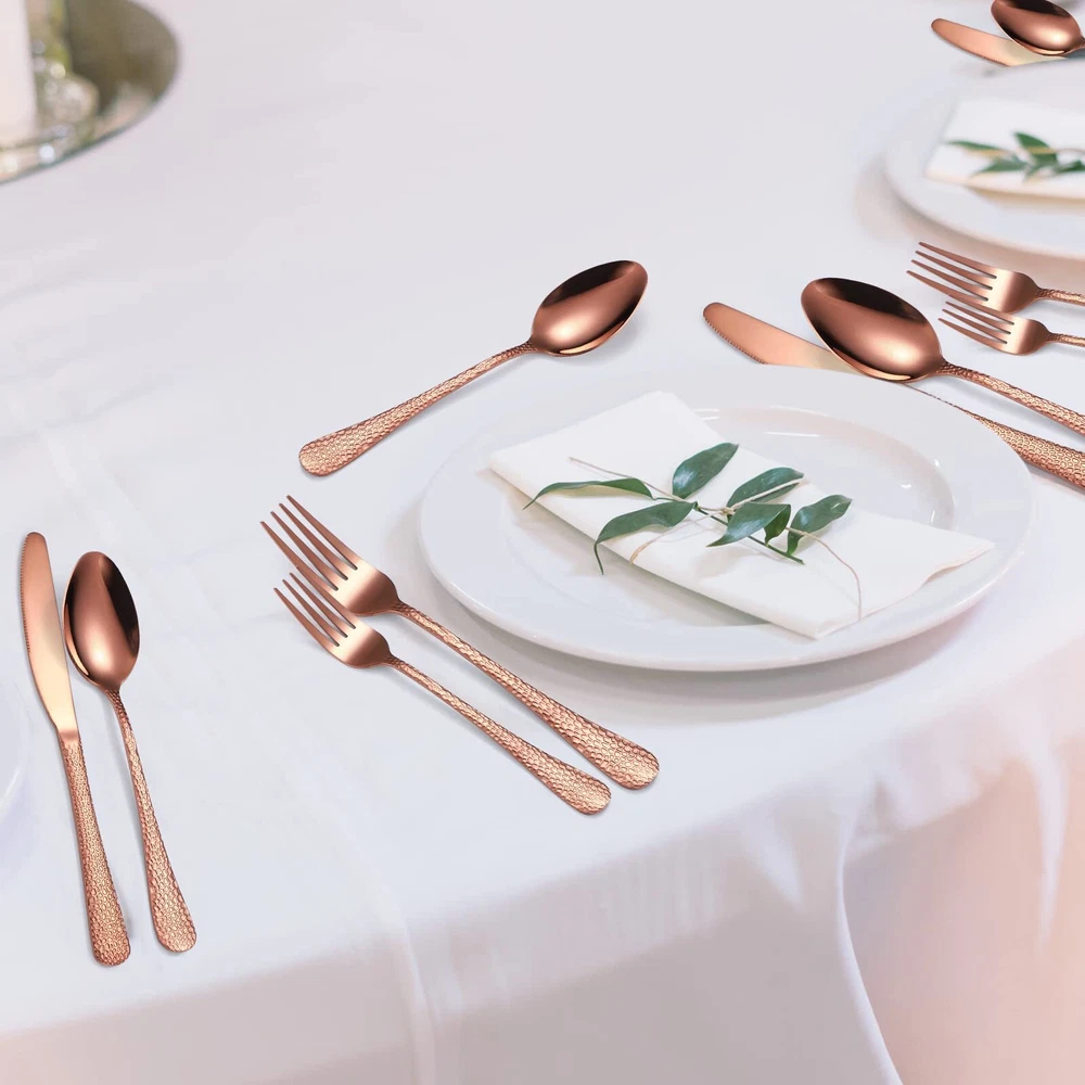 Hammered Silverware Copper/Rose Gold Flatware Set 40 Piece Service for 8 Stai...