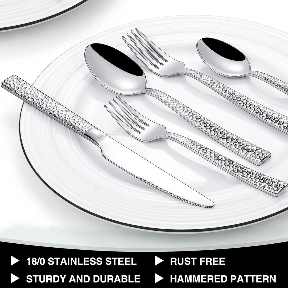 Hammered Silverware Set, 40-Piece Stainless Steel Square Flatware Set for 8, Food-Grade Tableware Cutlery Set, Utensil Sets for Home Restaurant, Mirror Finish, Dishwasher Safe Number of Pieces 40 Material Stainless Steel Color Mirror Finish Product Care Instructions Dishwasher Safe Recommended Uses For Product Indoor Special Feature Rust Resistant Finish Type Polished Included Components 8 Dinner Forks, 8 Salad Forks, 8 Dinner Spoons, 8 Dessert Spoons, 8 Dinner Knives Style Square Hammered About this item PREMIUM 40-PIECE SILVERWARE SET FOR 8: This flatware set contains 8 dinner forks, 8 salad forks, 8 dinner spoons, 8 dessert spoons, 8 dinner knives. It’s the ideal set for home daily use, and also for restaurants, pubs, cafes, and hotels. This cutlery set also help your dinner full of design while having a party. USE AND MAINTENANCE: Recommend hand wash first, storage them after drying. Wire brush, hard sponge, cleaning cloth or any other hard material are not recommend , it will damage the silver. PROPER WEIGHT AND COMFORTABLE HANDLE: The curvature of our utensil handles is designed according to the posture of the hand, and the appropriate weight and perfect balance are added to ensure maximum comfort during use that avoids you feel tired. Moreover, the smooth edges ensure safety and no scratches. ASHIONABLE APPEARANCE - Elegant style with hammered design on the front side of each square handles, Making every meal like a high-end banquet and bring a pleasant dining atmosphere, Matching different tablecloths, The design of the handle can highlight more styles HIGH-QUALITY STAINLESS STEEL: Made of premium food-grade stainless steel, providing the longest term value and the best properties, it offers nice resistance to rust and corrosion to get the most sturdy and healthy experience while using, never bend in daily use.