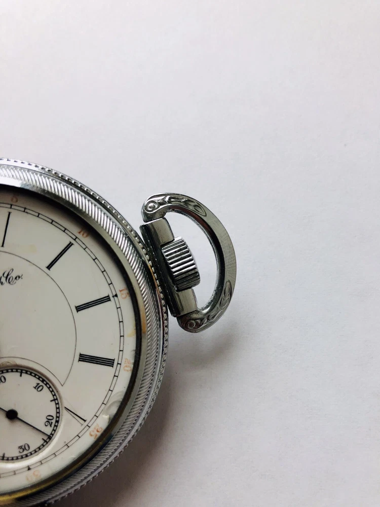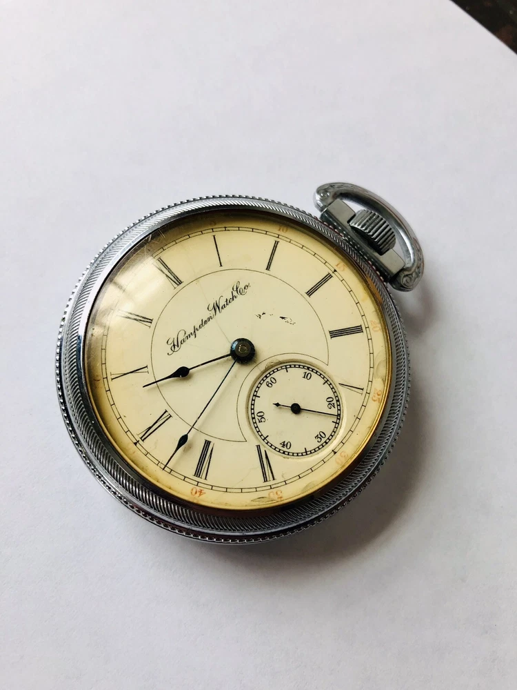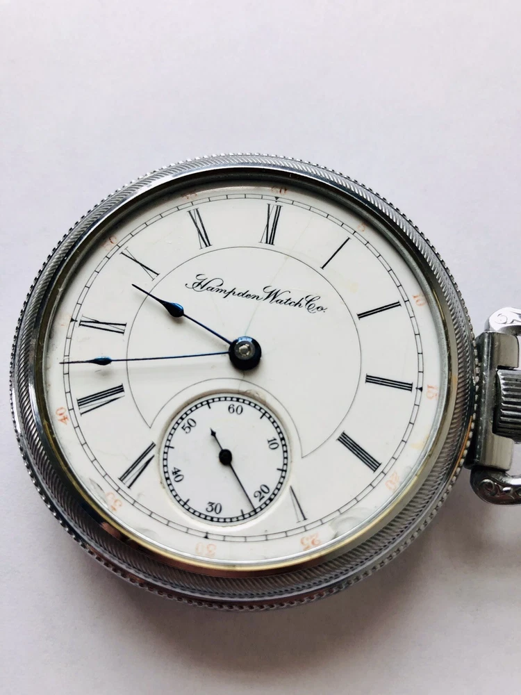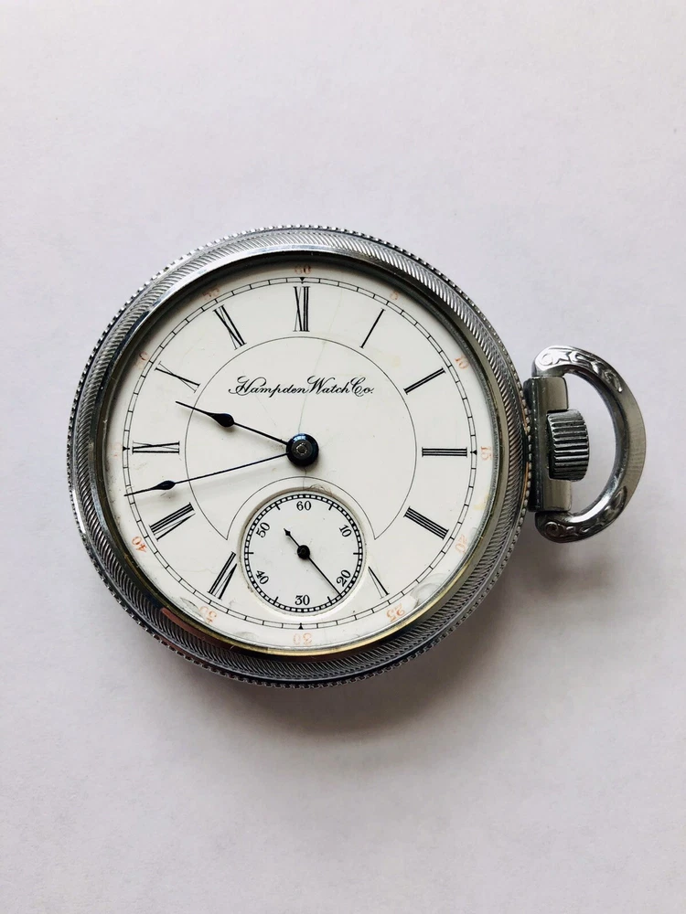 Brand: Hampden Department: Men Case Material: Silver Dial Color: White Movement: Mechanical (Manual) Customized: Yes Type: Pocket Watch Caseback: Snap Display: Analog Style: Dress/Formal Year Manufactured: 1900-1909 Country/Region of Manufacture: United States Case Color: Silver