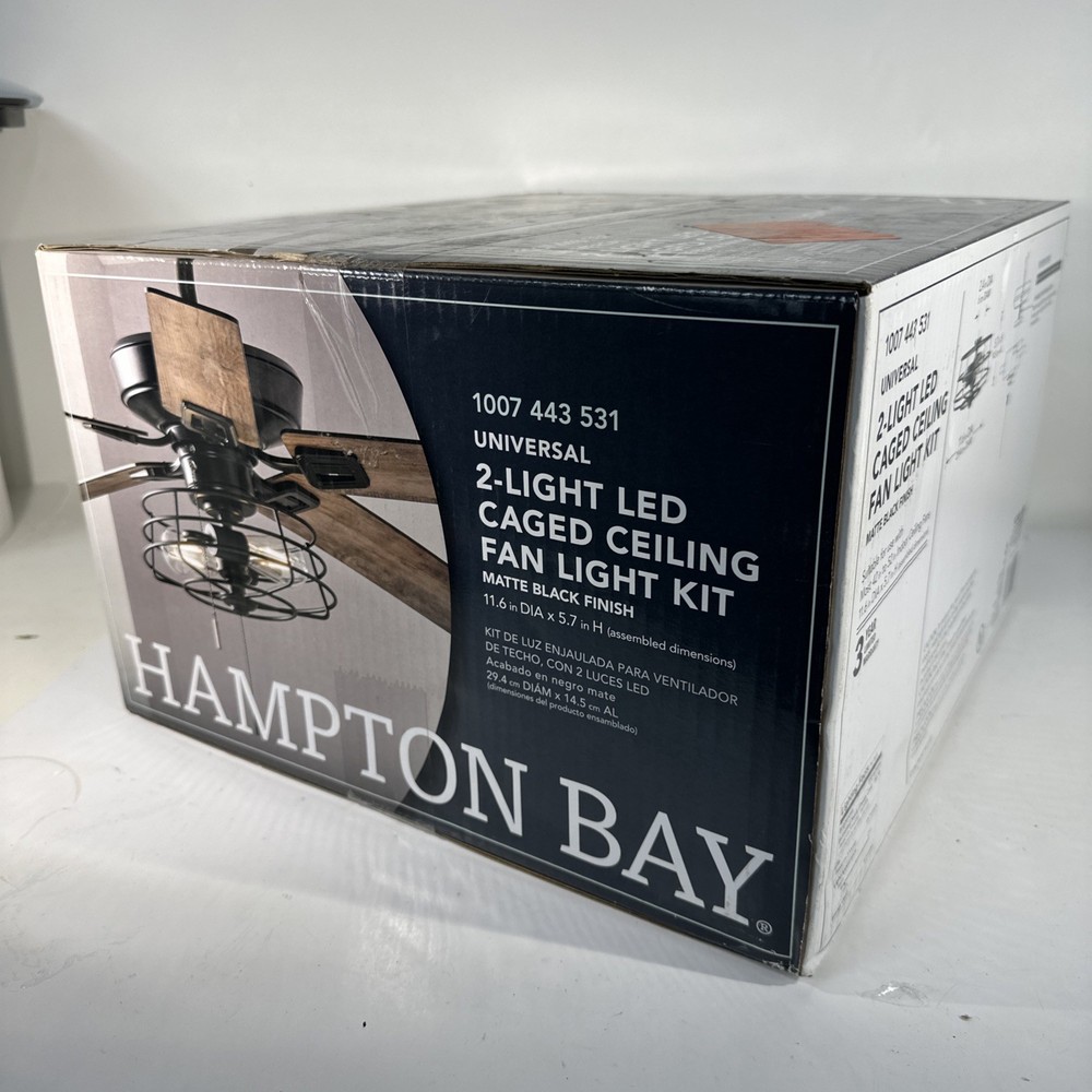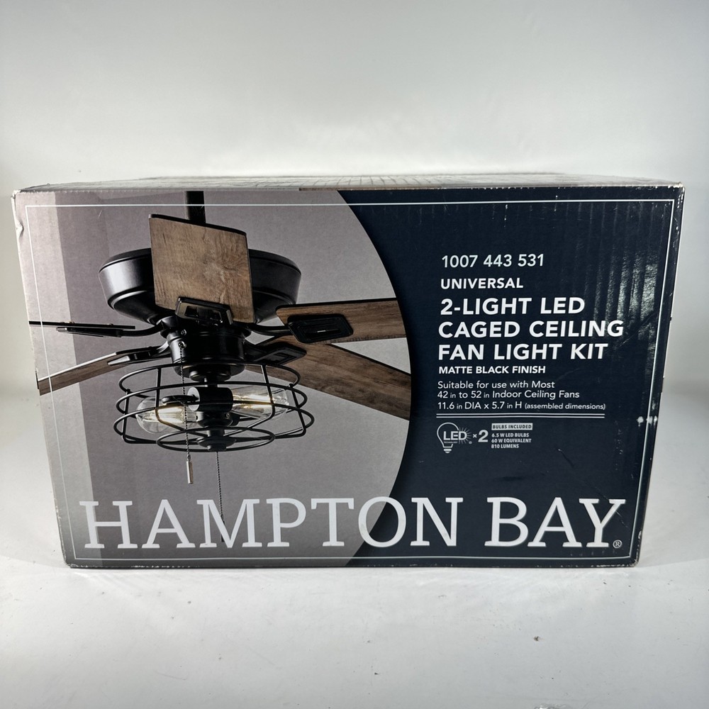 The Hampton Bay Universal 2 Light Caged Ceiling Fan LIGHT KIT ONLY in Matte Black is a stylish and functional addition to any home decor. This kit includes 2 light fixtures designed specifically for Hampton Bay ceiling fans, adding a touch of elegance to your space. The matte black finish enhances the contemporary look of the caged design, ensuring it will complement any design aesthetic seamlessly. Perfect for those looking to upgrade their lighting and create a cohesive, stylish look throughout their home.