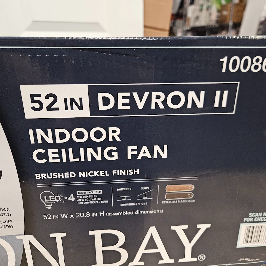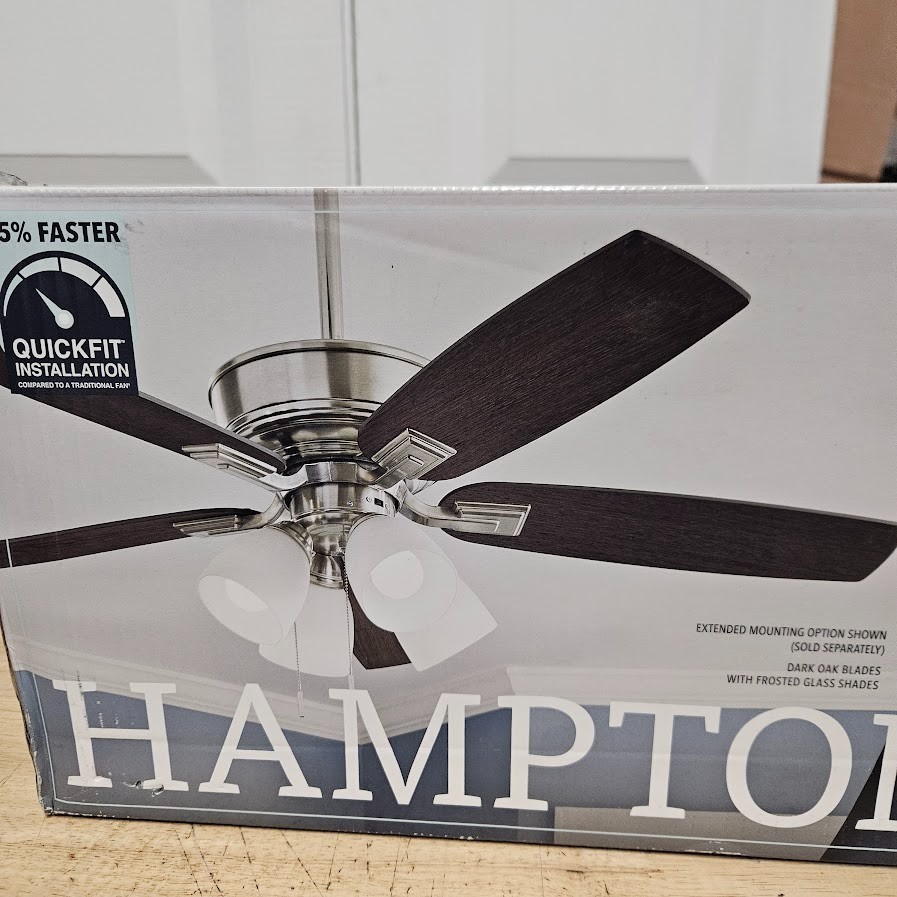 Hampton Bay Devron II 52 in. Indoor Brushed Nickel Ceiling Fan w/ LED Light Kit Highlights 52 in. blade span ideal for medium to large indoor rooms Brushed nickel finish with classic, timeless design Includes (4) 9-Watt LED bulbs for bright, energy-efficient lighting 5 reversible blades in dark oak and stained oak finishes Quick Fit installation system installs up to 25% faster Slide-on mounting bracket for easier setup AccuArm blade arms ensure wobble-free performance Dual-mount installation for standard or angled ceilings Includes 6 in. matching downrod 3-speed reversible motor delivers up to 4,587 CFM airflow Pull chain control for simple operation About This Product The Hampton Bay Devron II 52 in. Ceiling Fan blends traditional elegance with modern installation features and reliable performance, making it a great addition to a variety of indoor spaces. Finished in brushed nickel and paired with reversible blades in dark oak and stained oak, this fan offers versatile styling to match your décor. Designed for convenience, the Quick Fit installation system—including Quick Install blades, a slide-on mounting bracket, and AccuArm blade arms—reduces installation time while ensuring a secure, wobble-free setup. The included 6-inch downrod supports proper airflow and flexible mounting options, including angled ceilings. The integrated 4-light kit provides maximum illumination and includes four energy-efficient 9-Watt LED bulbs, offering long-lasting performance while reducing energy consumption. The 3-speed reversible motor delivers up to 4,587 CFM, allowing you to cool your space in the summer and circulate warm air during colder months. With its combination of classic design, efficient lighting, and easy installation, the Devron II ceiling fan is a dependable and stylish upgrade for living rooms, bedrooms, and more. We take great care to inspect all items and ensure they are accurately described. Should you have any issues with your purchase, please let us know immediately. We are committed to resolving any concerns promptly and to your satisfaction. Our small business truly appreciates your patronage. hampton bay ceiling fan 52 inch ceiling fan brushed nickel ceiling fan indoor ceiling fan with light LED ceiling fan reversible blade ceiling fan traditional ceiling fan pull chain ceiling fan 5 blade ceiling fan living room ceiling fan bedroom ceiling fan energy efficient ceiling fan home ceiling fan fixture
