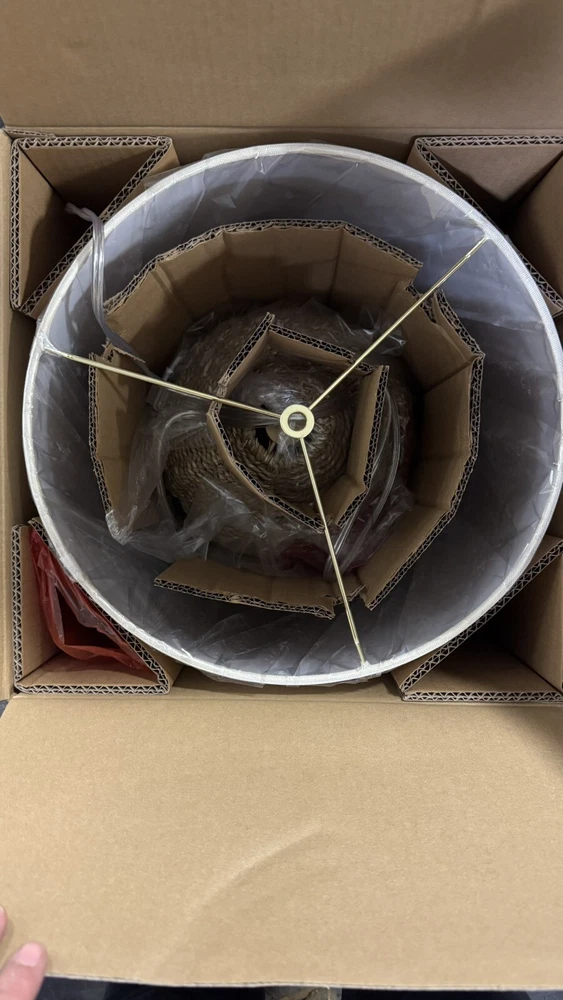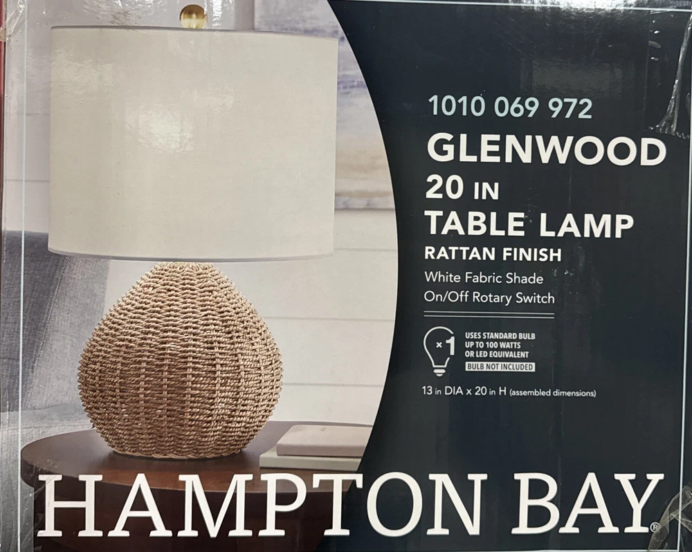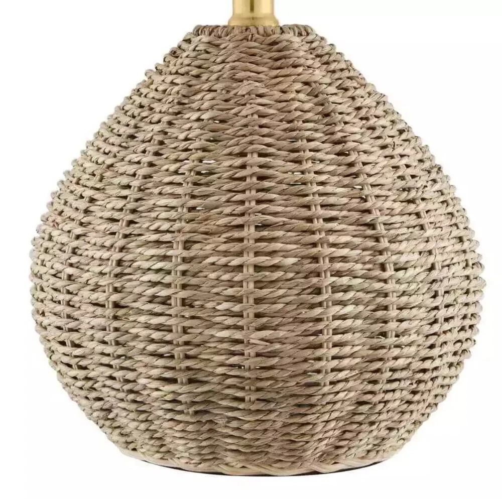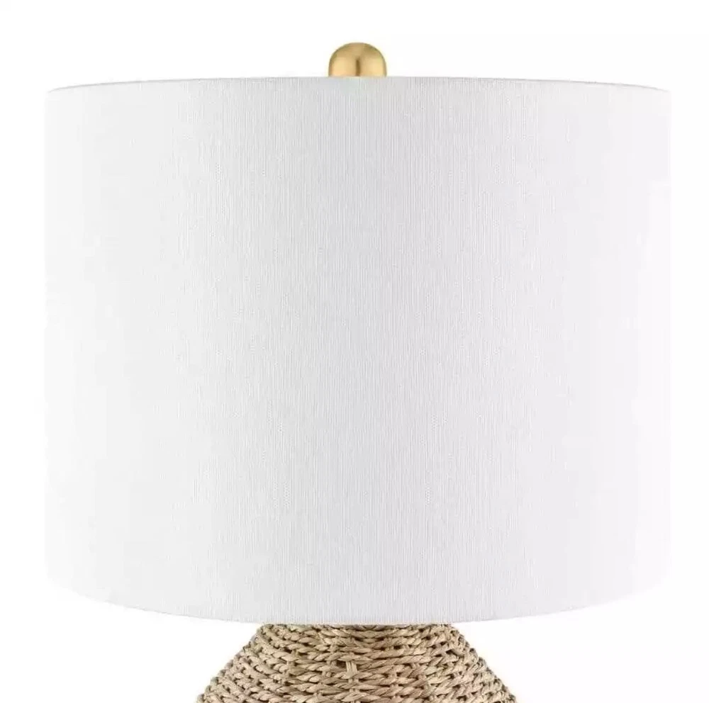 About This Product This woven table lamp with a rotary switch highlights both coastal and bohemian designs. At 20 in. tall, our rattan table lamp is the perfect addition to any entryway or living room. Its lightly colored cotton shade complements the rattan base, adding a traditional yet rustic touch to any space. Traditional brown woven base with a white cotton drum shade and brass gold accents Brass gold rotary switch, this lamp adds a classic touch to any space Bohemian touches include not just the rattan woven lamp base but also the traditional cotton shade Includes an elegant, clear, plastic cord of 60 in. L Complement the room with the glorious gold interior harp and finial behind the lampshade Compatible with the maximum wattage of a type a 100-Watt or LED 16-Watt bulb Drum-shaped cotton fabric shade with a gourd-like rattan body