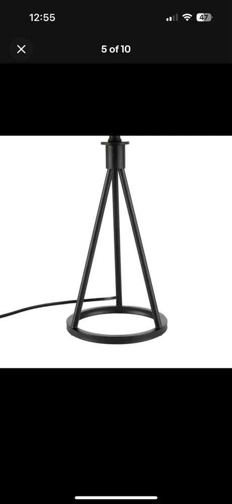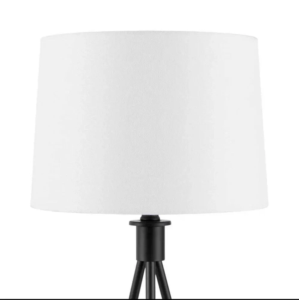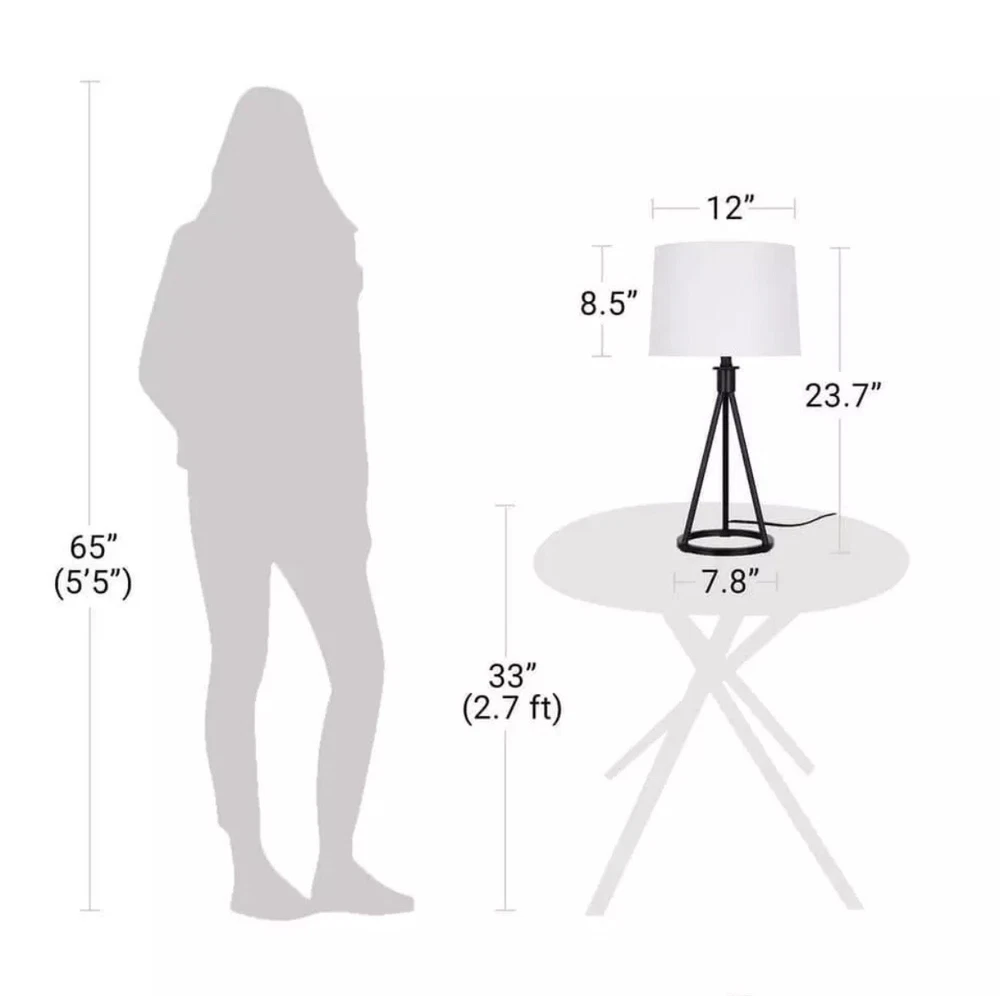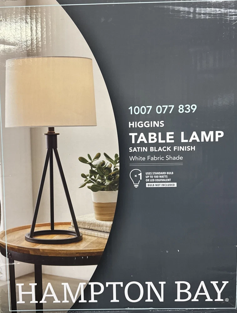 About This Product Brighten your space with the mid-century inspired Hampton Bay 23.75" Metal Tripod Higgins Table Lamp. This lamp features a sturdy metal tripod frame in modern black satin finish, with a matching black metal lamp neck for a seamless and elegant look. Topped with a 12" wide white linen drum shade, this lamp provides ample ambient lighting without harsh glare. Uses one standard A19 E26 light bulb, max 9-watt LED or 60-watt incandescent (light bulb not included). A black 60" power cord completes the lamp's contemporary look. Modern metal table and desk lamp features circular tripod base for an airy look that provides excellent balance, in black satin finish Classic white linen drum shade is slightly tapered outward to provide ample lighting without harsh glare Assembled Dimensions: 12" W x 23.7" H; space-saving lamp base measures 7.8" Dia. Shade Dimensions: 11" wide at the top, 12" wide at the bottom, 8.5" tall Features a 2-way rotary switch located on base of bulb socket; 60" matching black power cord; ETL certified for safety Uses one standard A19 E26 light bulb, max 9-watt LED or 60-watt incandescent equivalent (light bulb is not included) Pair with coordinating Hampton Bay Higgins Floor Lamp (sold separately)