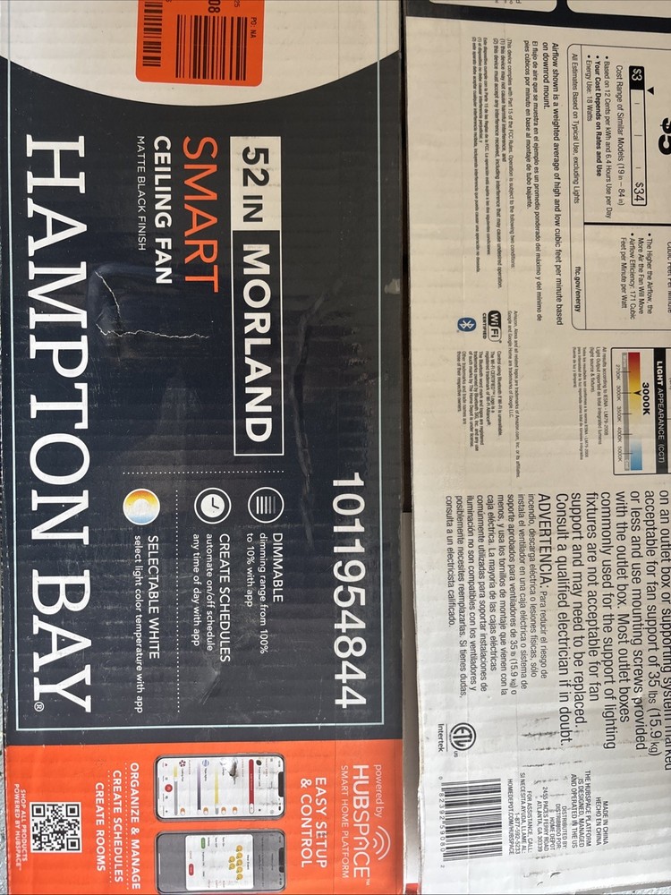 The Hampton Bay Morland 52" Smart Matte Black Indoor Outdoor Ceiling Fan with LED lights and remote control is a modern and stylish addition to any room. With a steel housing and a DC motor, this fan offers efficient and powerful airflow with a maximum motor speed of 160 RPM. The fan features a 6-speed control, remote access, and adjustable white LED lighting technology, making it suitable for both indoor and outdoor spaces. The fan is designed for large rooms and has a sleek matte black finish with black and brown blades, adding a touch of sophistication to any space. Bought from a pallet for resale box looks open nothing untouched few minor dents inbox. Everything is in the box sold as is.