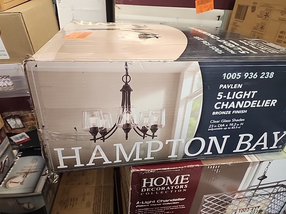 Add a touch of elegance to your living space with this stunning Hampton Bay Pavlen 5-Light Rustic Bronze Hanging Chandelier. The chandelier features a bell shape and an empire fixture design with clear glass shades that provide an ambient light direction. It is hardwired and has a maximum hanging length of 83.5 inches. The chandelier is suitable for use in the bedroom, dining room, foyer, or living room and has a rustic finish. It is made of metal and glass and has a single tier with five lights. The recommended light bulb shape is A-Shape and has a maximum bulb wattage of 60W. This product is included with hardware and has a non-dimmable capability.