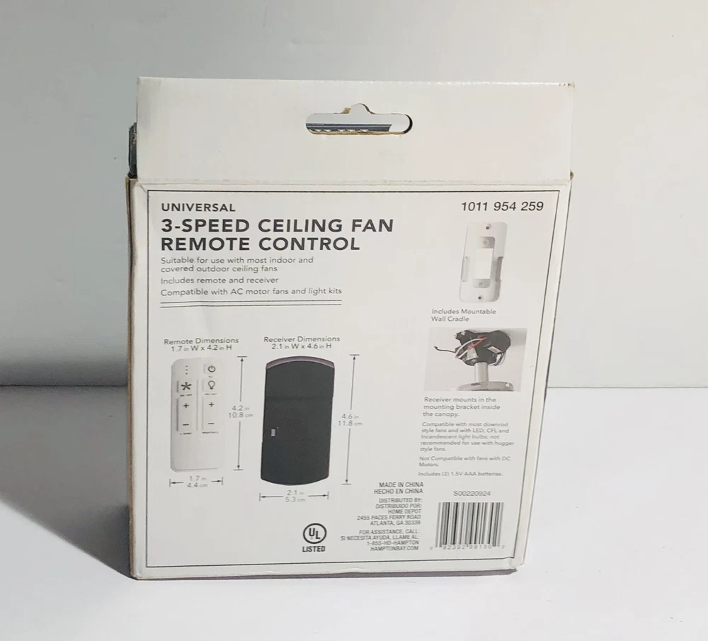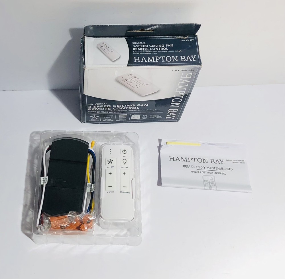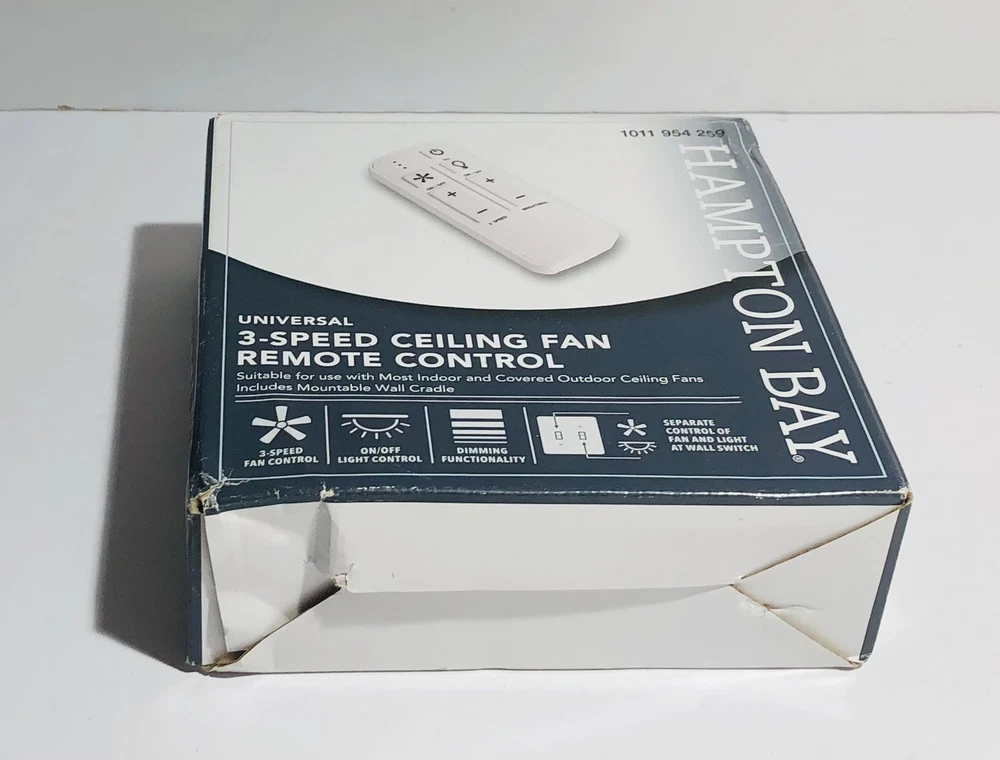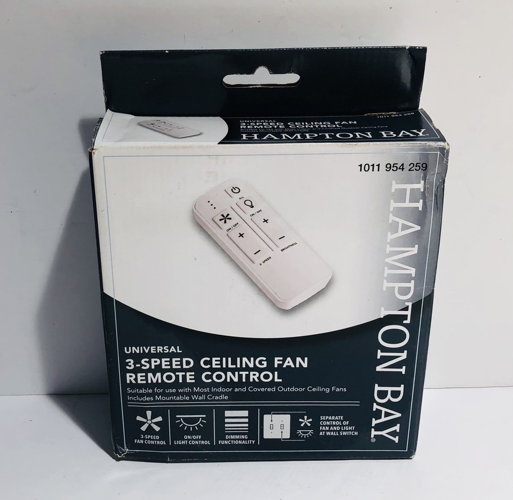 Hampton Bay White Universal 3-Speed Damp Rated Ceiling Fan Remote w/ Dimmer. Condition is Brand New With Open. Comes with everything you see in the pictures only. Please view pictures to evaluate for yourself. Shipped via USPS Ground Advantage.