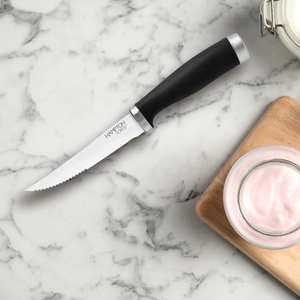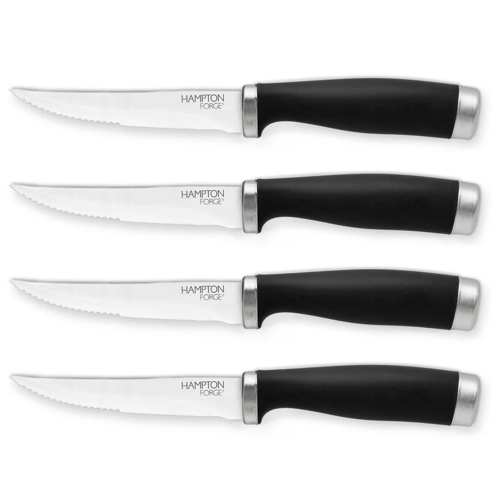 With a chic soft-grip, black handle, the Epicure 4 Piece Steak Set by Hampton Forge provides the balance and ergonomics needed to cut efficiently. Featuring a timeless design with exceptionally sharp stainless steel, serrated blades, polished to a mirror finish. Epicure will provide reliable dining year after year, and looks great in a casual or formal dining setting. HOLLOW-GROUND SERRATED EDGE – Factory ground to a precision edge for clean cuts; crafted from very high quality stainless steel that resists corrosion, rusting and pitting. SOFT GRIP HANDLE – Ergonomically designed offering comfortable, safe and slip-resistant cutting. UPGRADE YOUR CUTLERY – For a twist on the traditional, the Epicure Steak Set offers a bit of contemporary flair to place setting. Hand wash Recommended Set Includes: (4) 4.5" Steak Knives