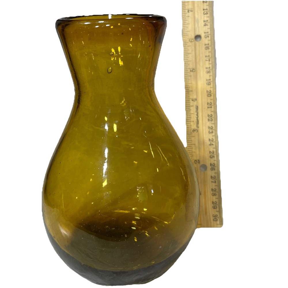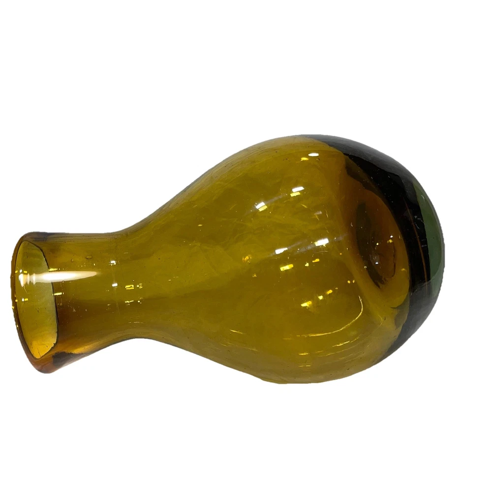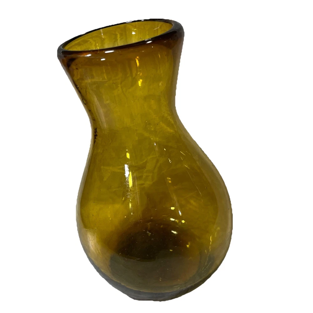 This hand-blown glass vase in amber is a modern and decorative piece perfect for any room in your home. Its round shape and unique handcrafted design add an artistic touch to your space. Made of glass with a beautiful amber color, this vase is easy to clean with hand wash only instructions. Add a touch of elegance to your living space with this stylish and eye-catching piece that is sure to be a conversation starter.