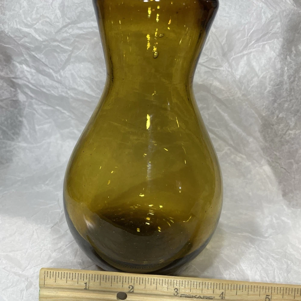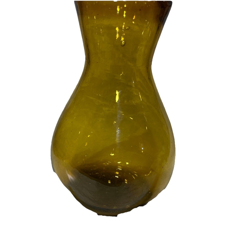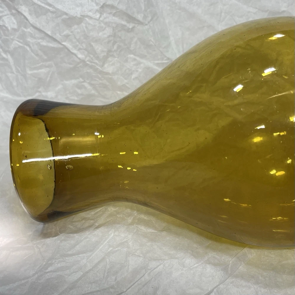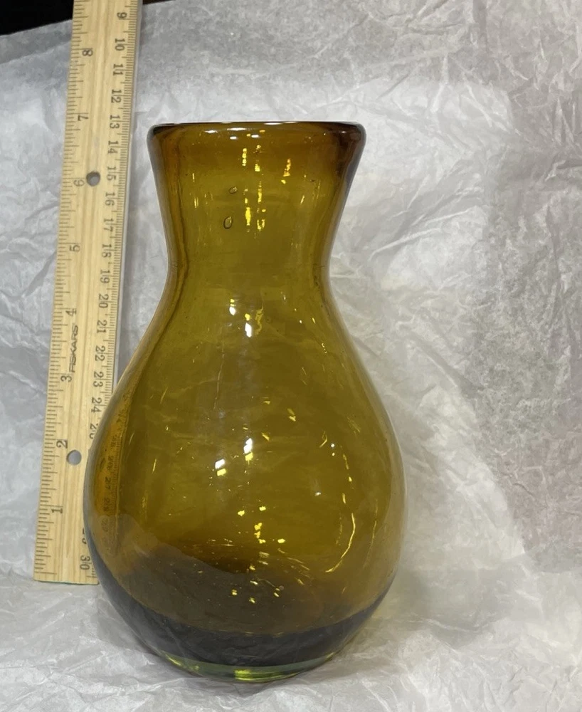 This hand-blown glass vase in amber is a modern and decorative piece perfect for any room in your home. Its round shape and unique handcrafted design add an artistic touch to your space. Made of glass with a beautiful amber color, this vase is easy to clean with hand wash only instructions. Add a touch of elegance to your living space with this stylish and eye-catching piece that is sure to be a conversation starter.