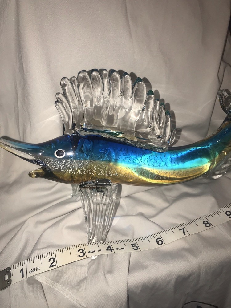 This hand-blown glass marlin fish is a unique and artistic decorative collectible. Crafted from glass with meticulous attention to detail, this original piece adds a touch of elegance and sophistication to any space. The marlin fish design, created through the meticulous process of blowing glass, makes it a standout piece for collectors or those looking to enhance their decor with a one-of-a-kind item.