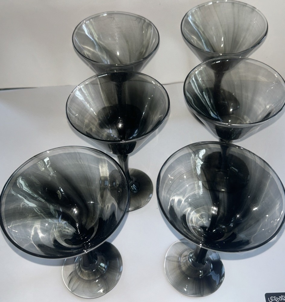 Hand Blown Martini Glass Cocktail Black Smoke Gray (lavender)Swirls Set of 6