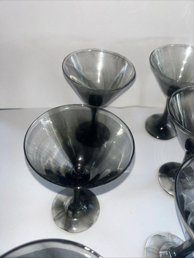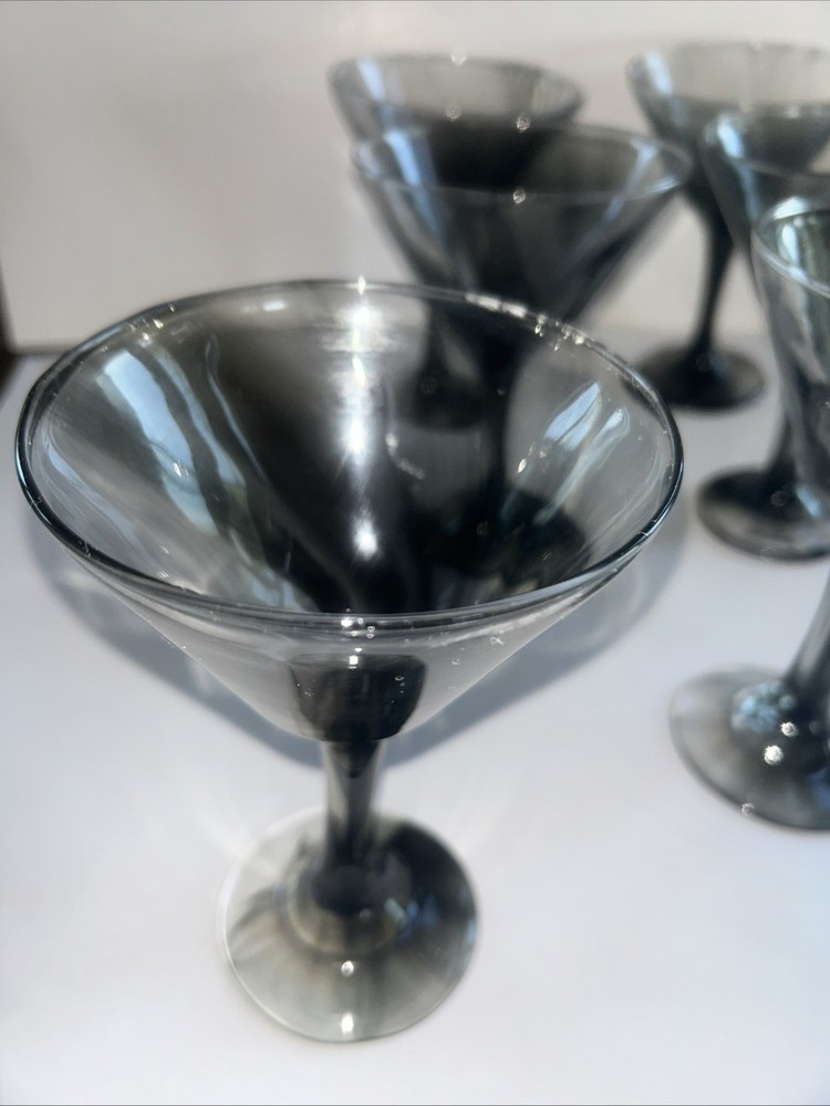 This set of 8 hand-blown martini glasses features a sleek black color with smoke gray swirls, adding a sophisticated touch to any home bar or kitchen decor. With a height of 6.5 inches and a width of 4.25 inches, these cocktail glasses are the perfect size for serving your favorite drinks. Made of high-quality glass, these glasses are both functional and stylish, perfect for impressing guests or enjoying a relaxing drink at home. kk5416