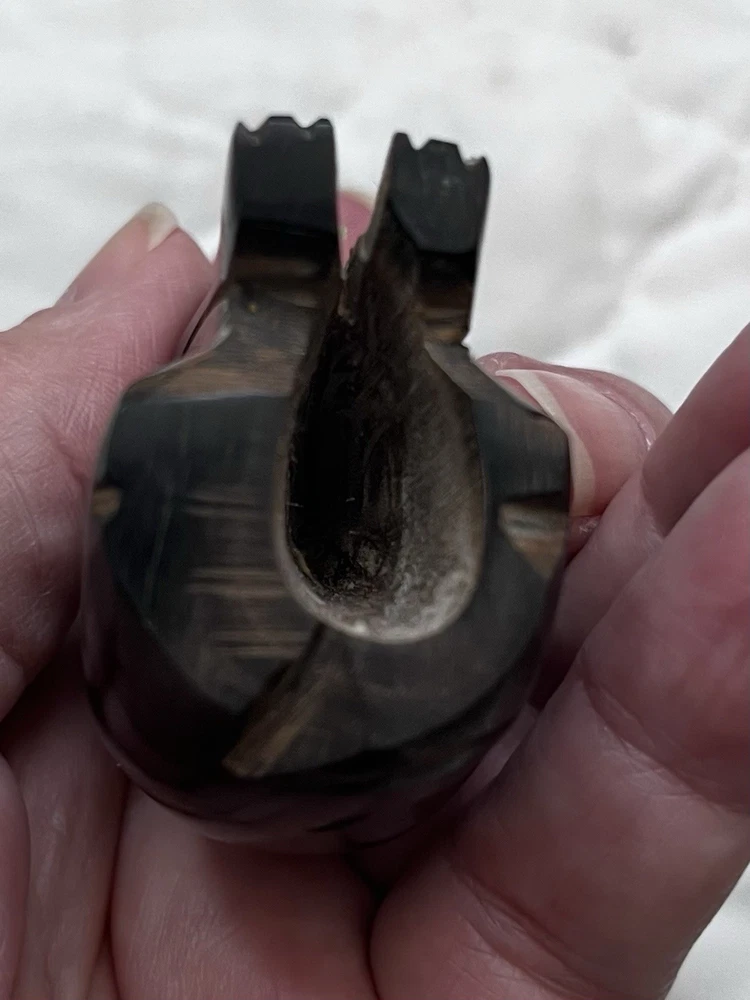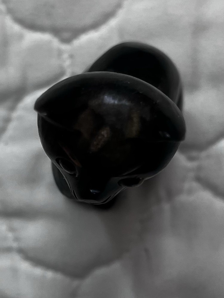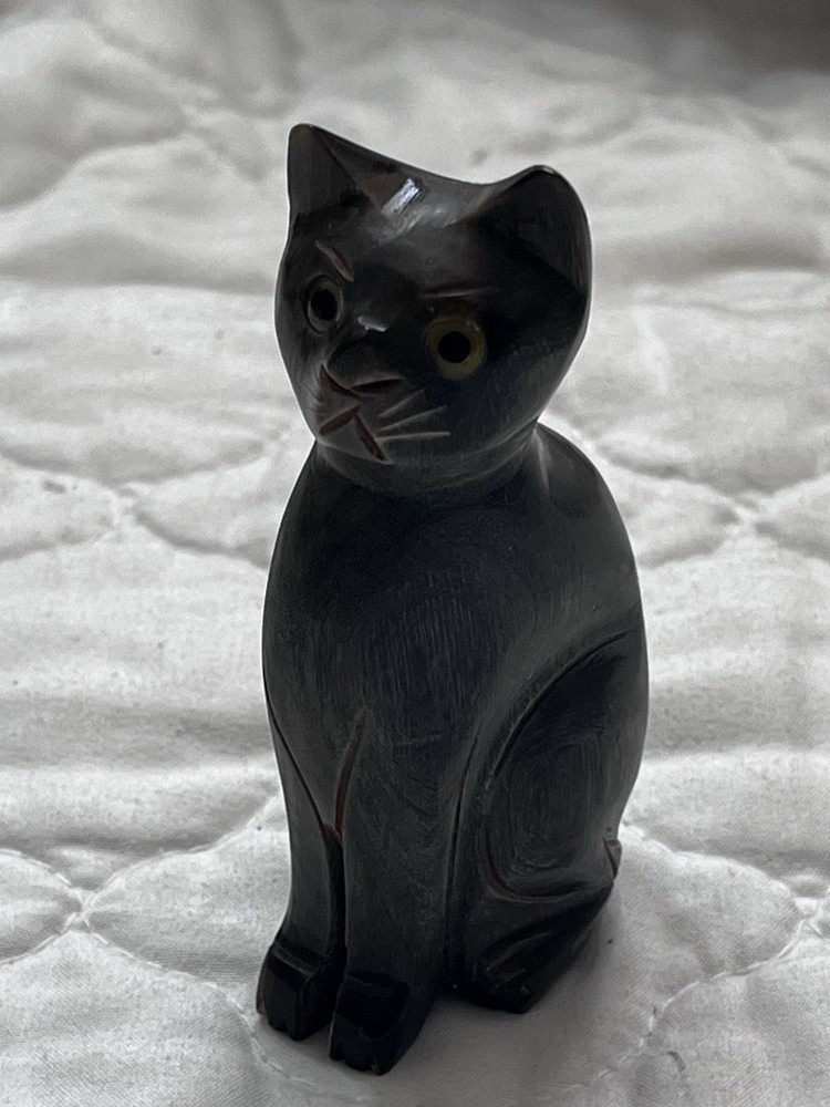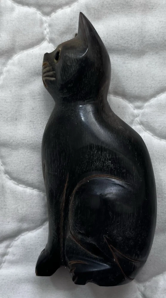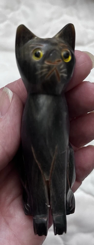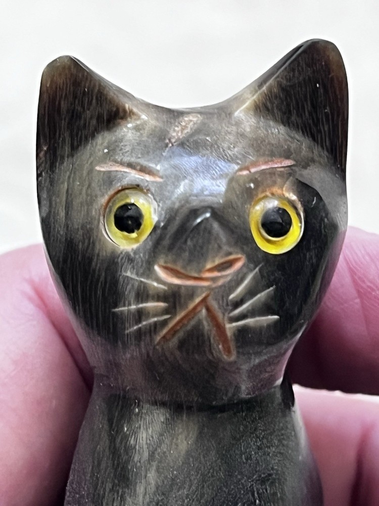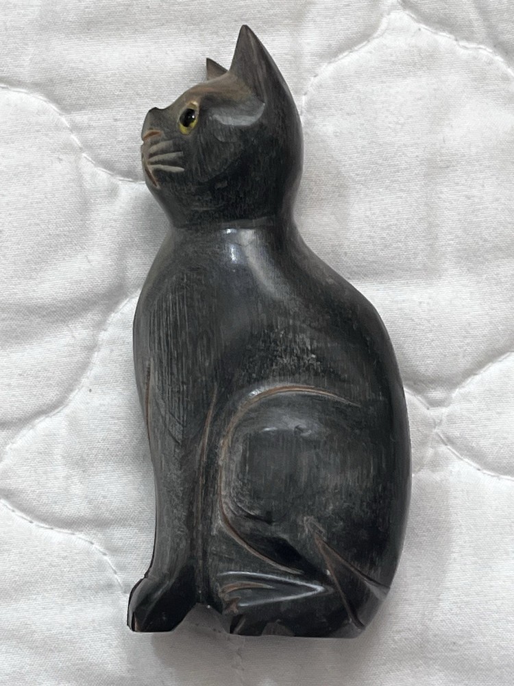 This hand-carved wooden cat figurine is a beautiful and unique piece of home decor. The intricate details and yellow eyes add a playful touch to any room. Made from wood, this sculpture captures the essence of a cat in a charming and artistic way, making it a perfect addition to any collection of cat figurines or animal sculptures. Size 3.75 x 1.5 inches