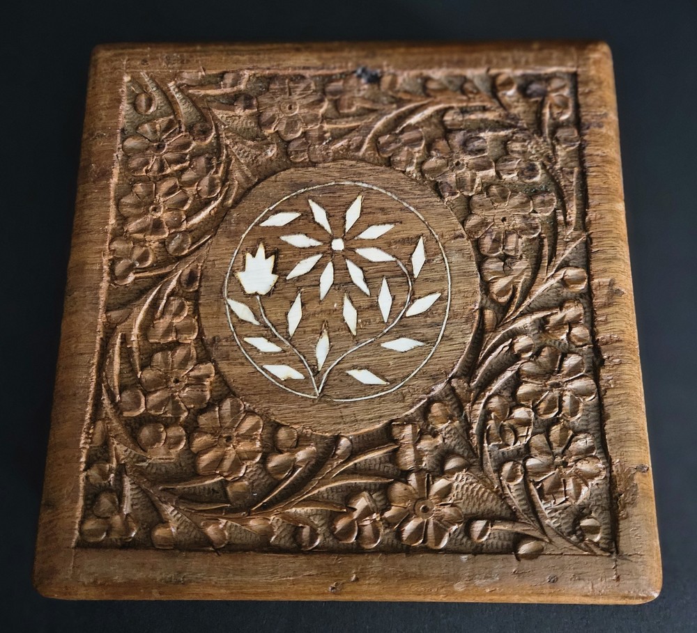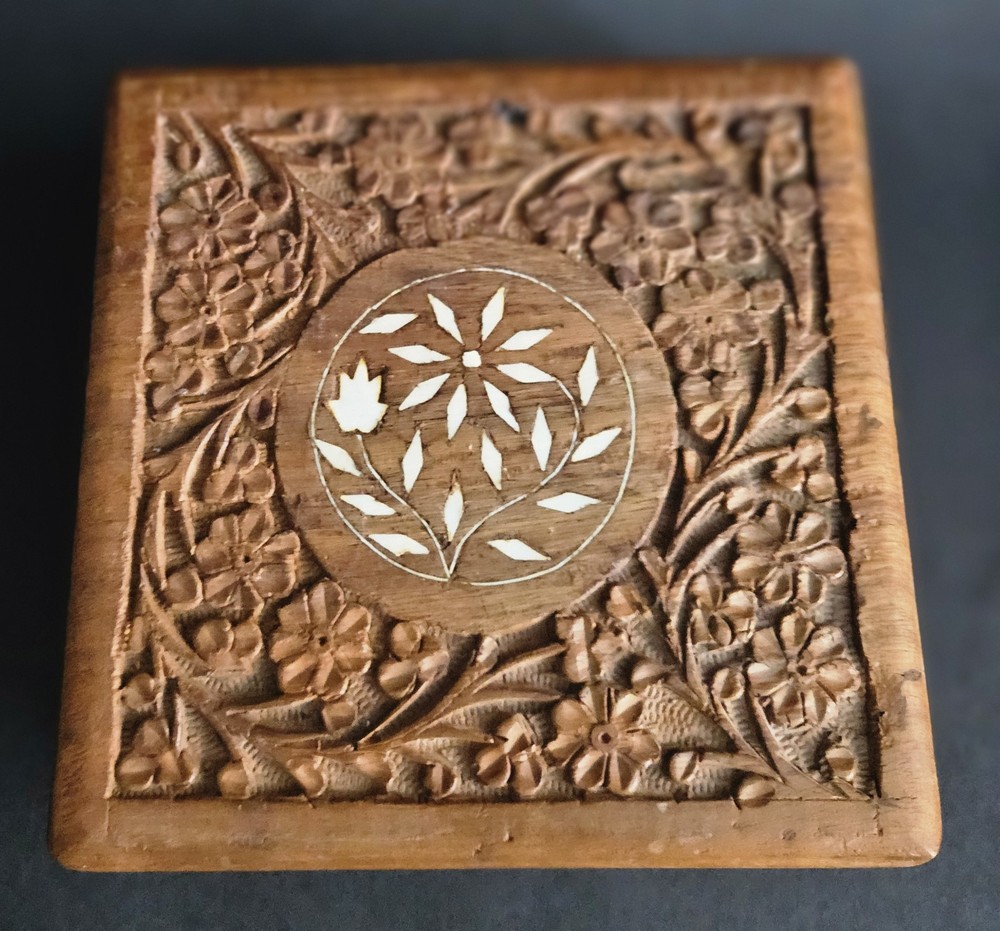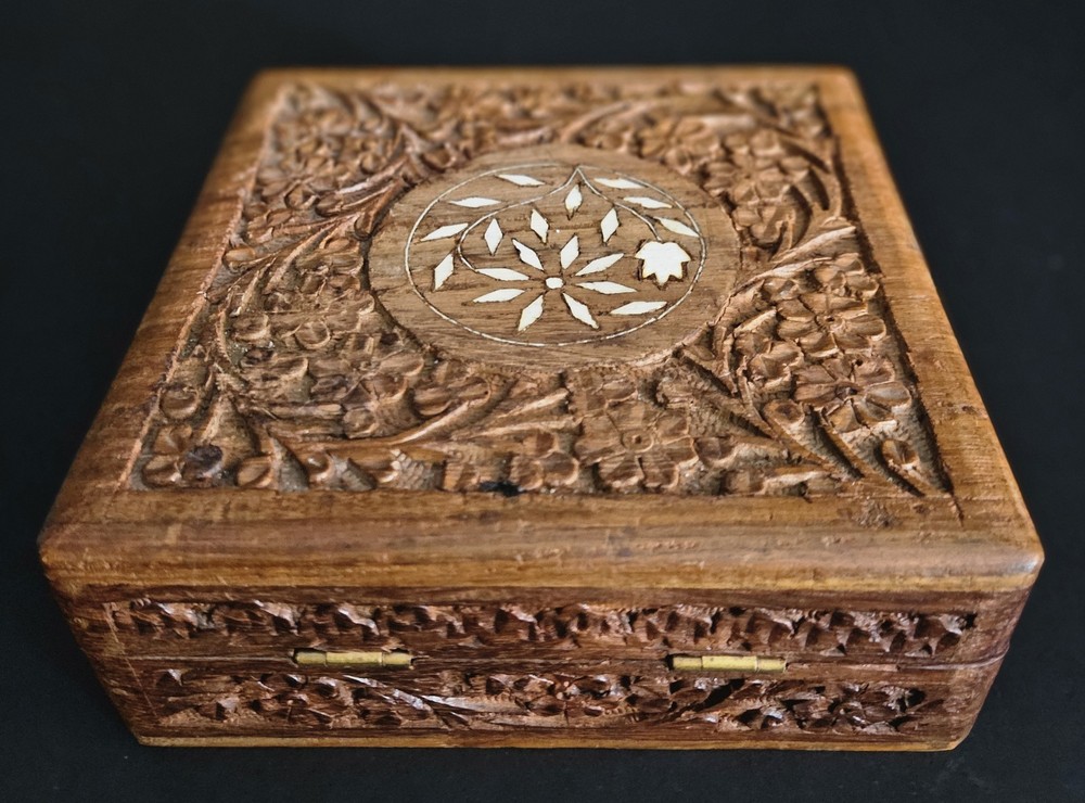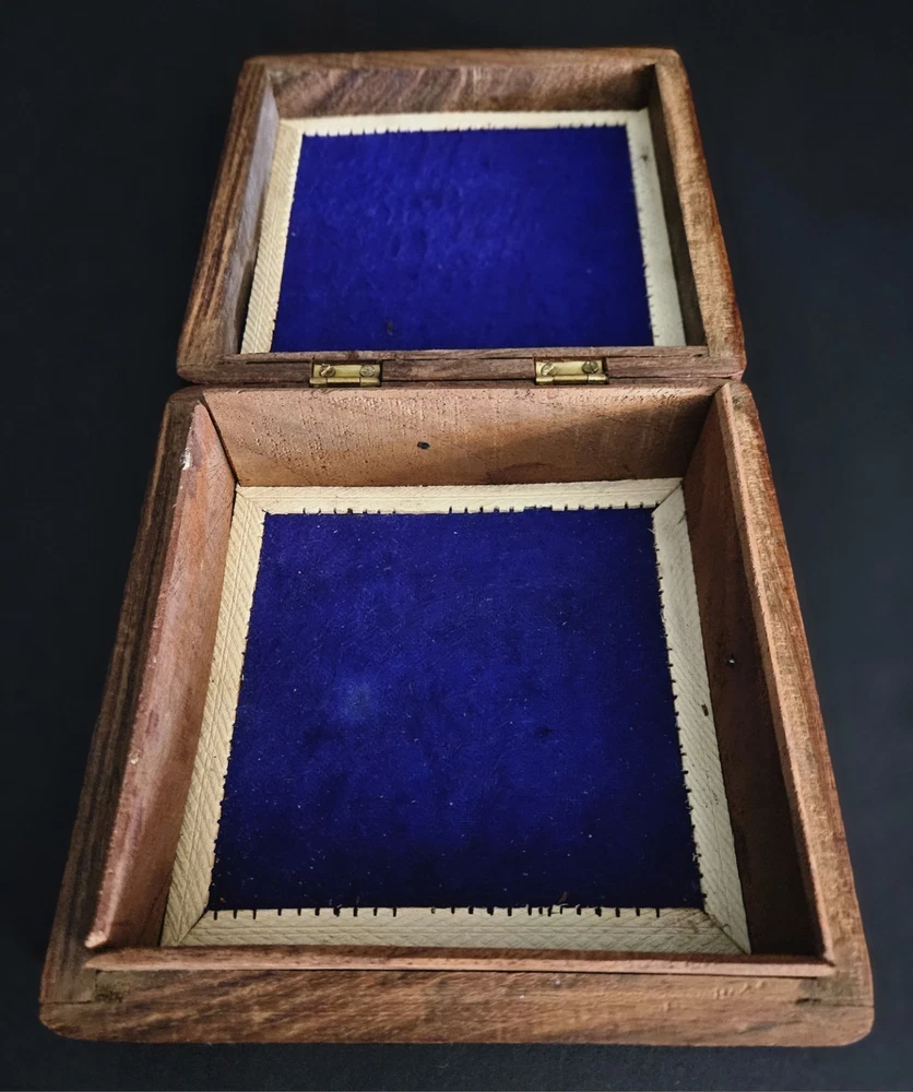 Vintage hand carved lidded hinged keepsake box with purple felt liner. 6"L x 6"W x 2.25"H. The purple felt is a little but worn. The box itself is in great condition.