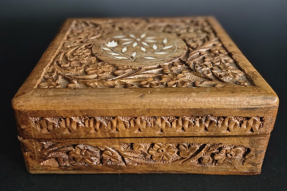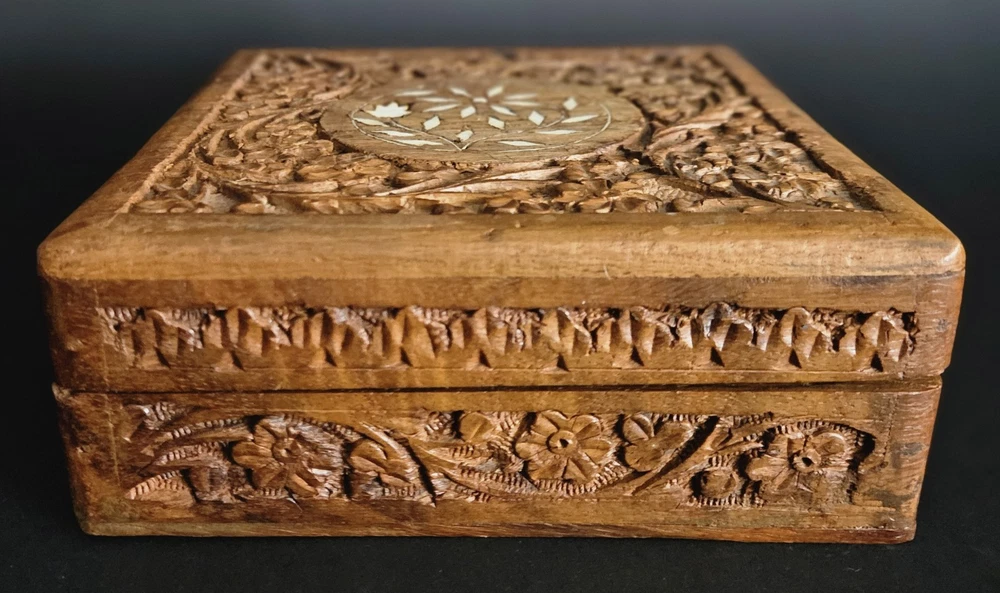 $ 129.36Handmade blond wood chip-carved trinket box with hinged lid 7.5x4.5x5 inches