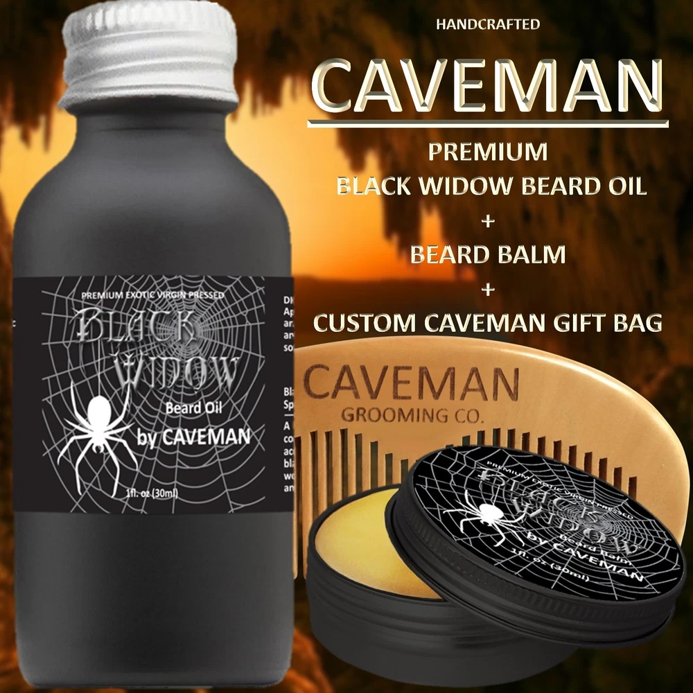 Hand Crafted Special Edition "Black Widow" Beard Oil 1oz By CAVEMAN ® Beard Oil (Comes in a custom Black bottle) Scent Name: BLACK WIDOW Scent: Mesmerizing + Beard Balm By CAVEMAN® + Hand Crafted - Hand Varnished and Engraved Wooden Beard Comb By CAVEMAN® A blend of Exotic Hair conditioning oils, accentuated with alluring black peppercorn, warm woods, patchouli, leather and citrus notes. Almost good enough to bite! New! Fast Shipping! One bite from this Black Widow may cause intense romantic interludes which may include severe panting, sweating and cursing. Use Black Widow Special Edition with exotic essential oils to lure your prey and to keep them coming. Men have been growing, grooming, trimming and shaving beards since the beginning of time. A look through history shows that the way that men have worn their facial hair has often followed cultural and traditional lines. It is very interesting to see how different trends developed over time. In more modern times growing, or not growing a beard, is often a ‘fashion statement’ and not just lack of grooming. It can take time and effort to create just the perfect beard, and keeping facial hair and skin in good condition should be an important part of grooming. CAVEMAN ® Premium Beard Oils We work hard to ensure that your oils are top-quality, highly concentrated and Handcrafted. Our goal is from the first moment you put on a few drops of our Premium Beard oil you will feel th e Luxurious, Hydrating and Conditioning experience your beard hair long deserved. As well as protecting the skin underneath . And of course – do not eat the oils. No matter how great they may smell. Rich in nutrients and readily absorbed by both hair and skin. Beard oil moisturizes facial hair and the skin beneath. Beard oil is hydrating to the skin and helps soften and tame beard hair, which means it also does double-duty as a styling agent. the ideal beard should look shiny and groomed -- not dusty, flaky and shaggy. The best time to apply beard oil is right after washing your face. We recommend putting on beard oil first thing in the morning after showering or cleansing. Caring for skin, particularly cleansing and moisturizing is crucial, especially if you live in a cold or dry climate. We tend to think 'more is better,' but just a few drops of most things is plenty." Beard oil keeps facial hair flake-free and smelling fresh. Thanks to moisturizing oils, a little beard oil is just enough to tame those flyaway hairs and eliminate flakes (a.k.a. beard-druff). And with so many wonderful, full bodied aromatic essential oils like Bay Rum, Bay Leaves, Orange Peel and Zest. This also acts as a natural cologne.
