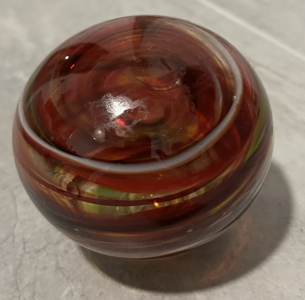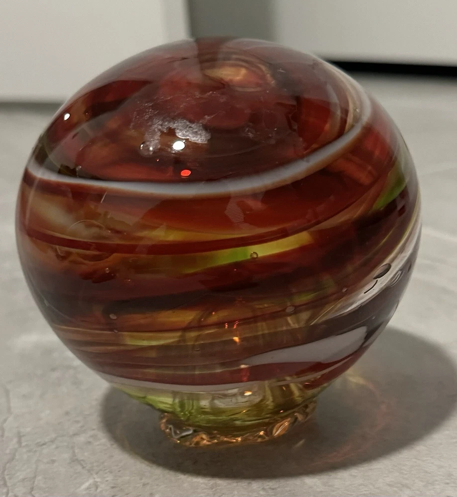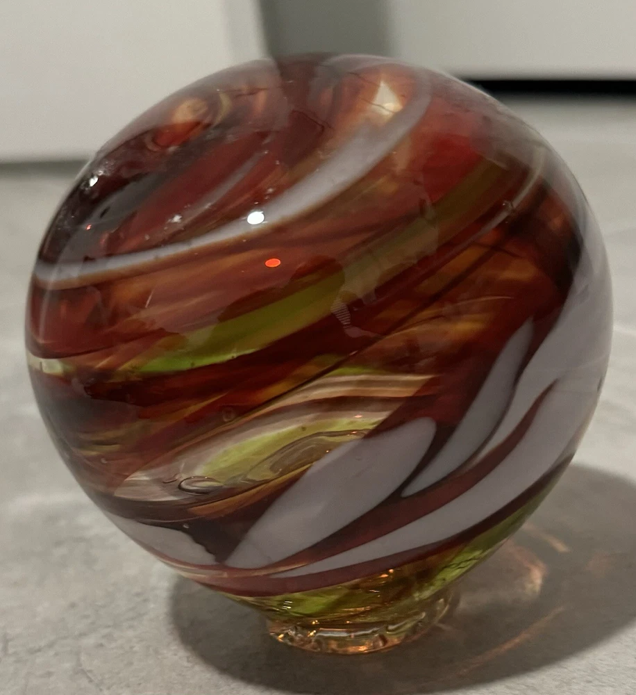 This beautiful glass ball was meticulously handcrafted in Oregon, showcasing a stunning swirl pattern in multicolored hues. The ball is a unique and eye-catching piece of art glass, perfect for adding a touch of elegance to any space. Its mid-century modern style and decorative features make it a perfect paperweight or display item. The ball is made of high-quality glass and is an original, licensed reproduction from the 21st century. Its production style is hand-blown glass, highlighting the craftsmanship and skill of the artist. This item is a must-have for any collector or lover of decorative art. Around 6 in diameter and around 6 in tall. Calculation may vary.