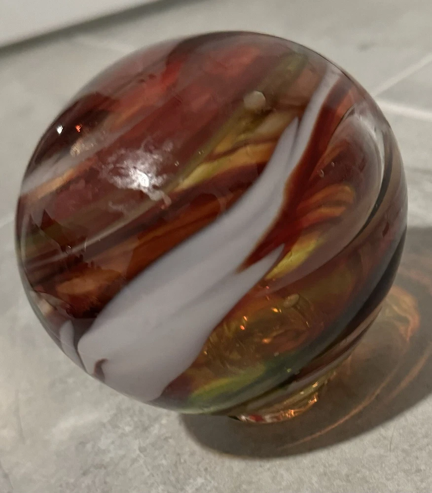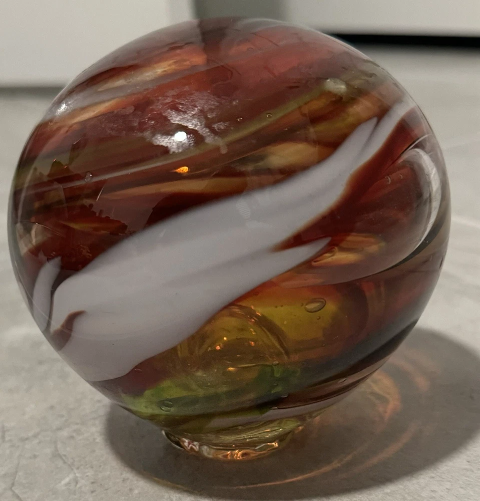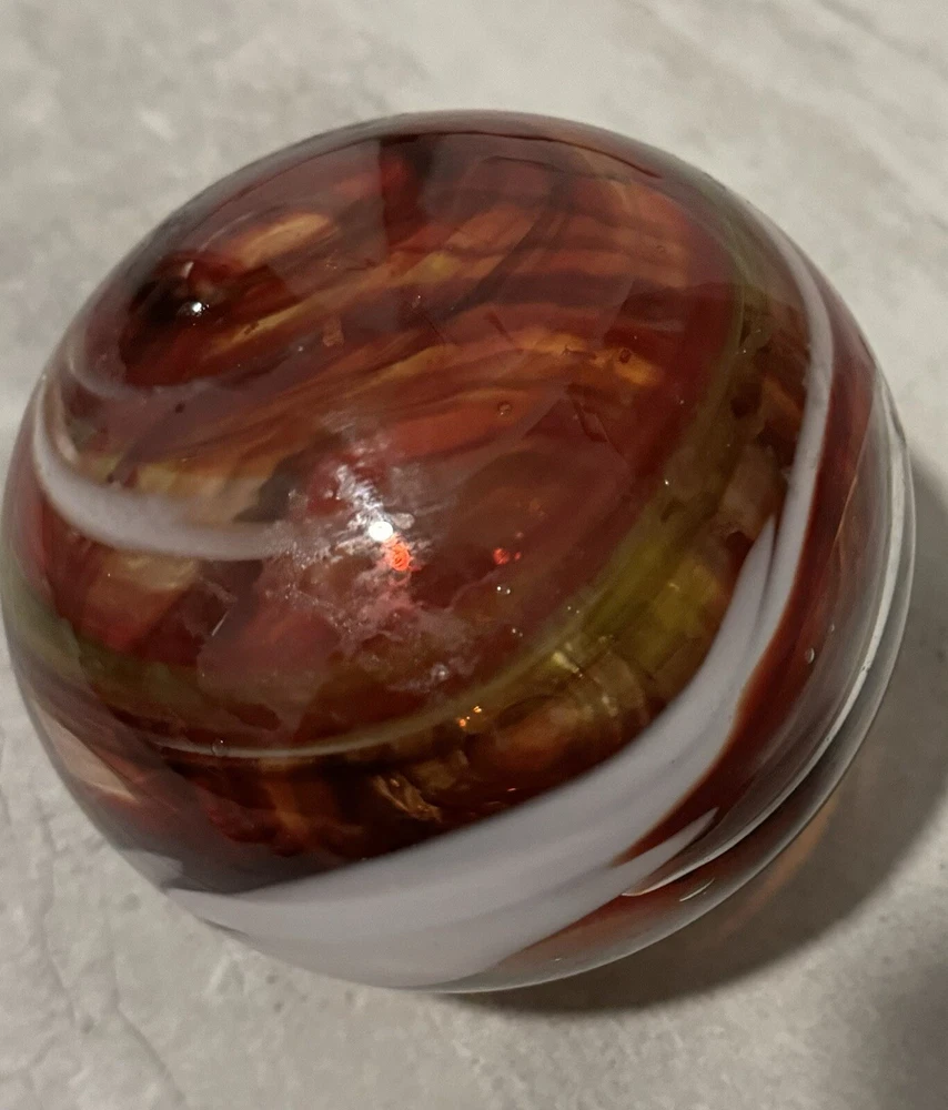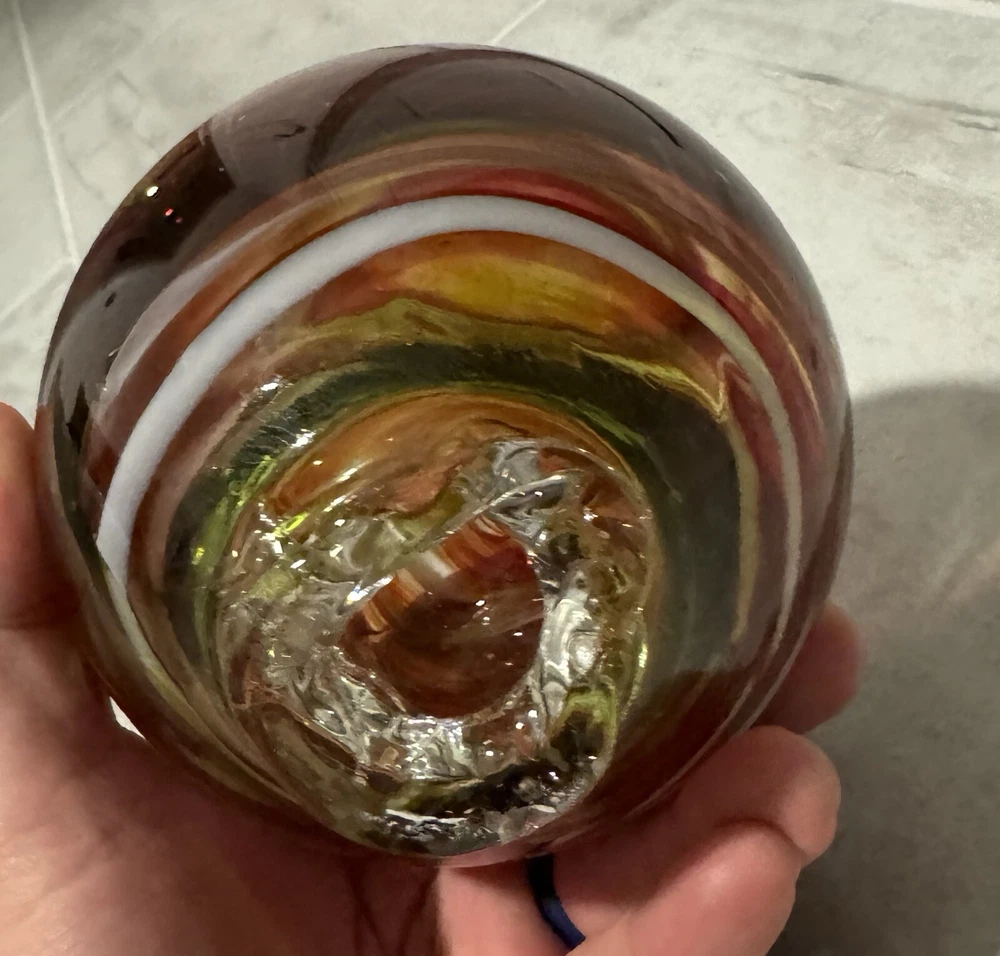 This beautiful glass ball was meticulously handcrafted in Oregon, showcasing a stunning swirl pattern in multicolored hues. The ball is a unique and eye-catching piece of art glass, perfect for adding a touch of elegance to any space. Its mid-century modern style and decorative features make it a perfect paperweight or display item. The ball is made of high-quality glass and is an original, licensed reproduction from the 21st century. Its production style is hand-blown glass, highlighting the craftsmanship and skill of the artist. This item is a must-have for any collector or lover of decorative art. Around 6 in diameter and around 6 in tall. Calculation may vary.