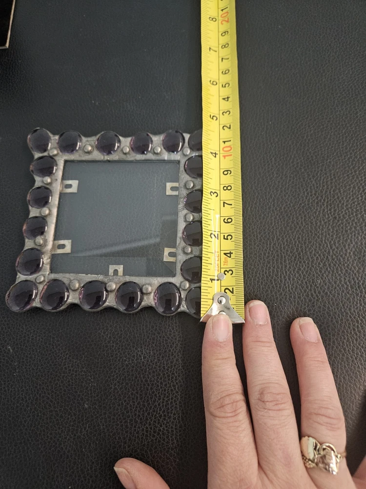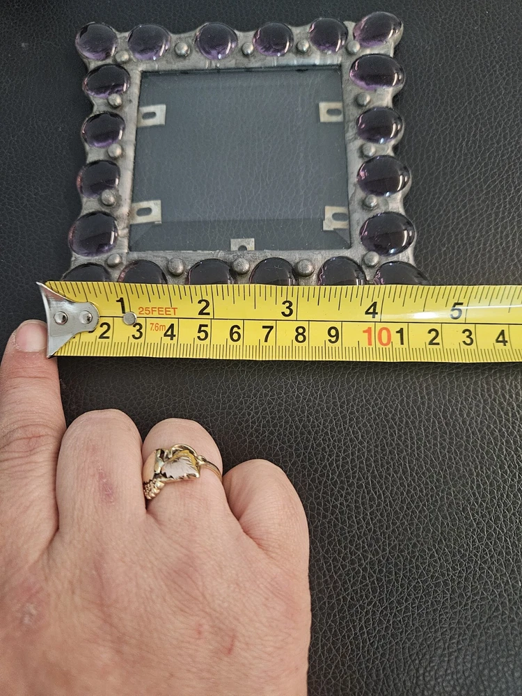 Vintage 1976 Hand Crafted Glass Picture Frame with a square shape, purple stained glass, and a size of 3x3 inches. The frame features fused leaded glass in a 1970s style, with a glossy finish. It is free-standing and can hold a single photo. The brand is Handcrafted and the frame is original from the 1970s.