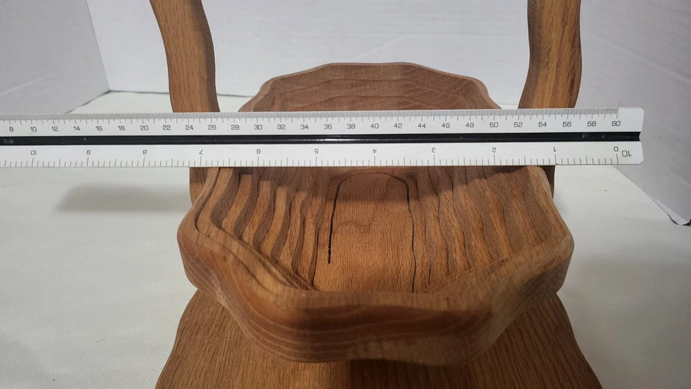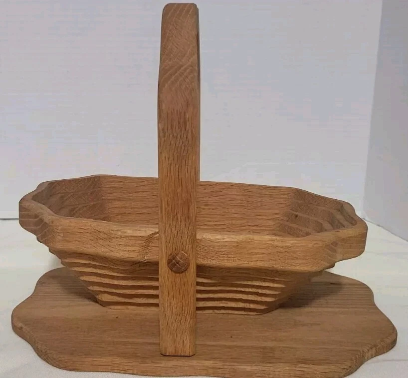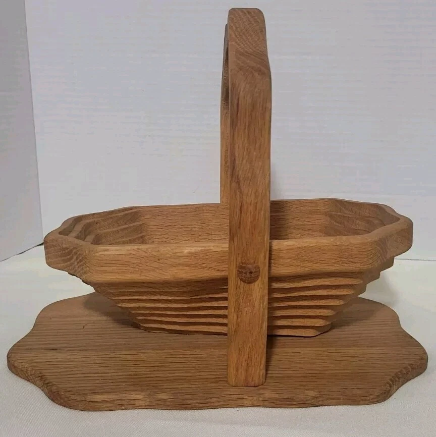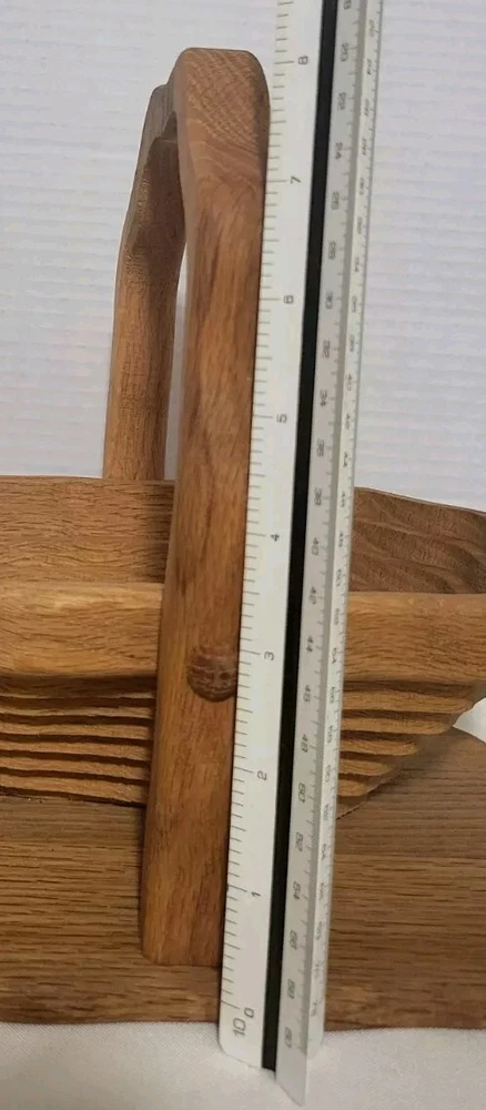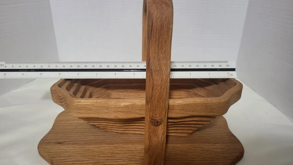 This handcrafted wooden basket is perfect for storing fruits, vegetables, and other items. The basket features a collapsible and folding handle for easy storage and transportation. The natural finish adds to its modern style and charm. Measuring 11 inches in length, 9 inches in height, and 8 inches in width, this medium-sized basket is perfect for any room in your home. Its weave pattern and rectangle shape make it a unique and beautiful addition to your home decor. The basket is an original piece, manufactured in 1970 and is perfect for collectors or as a decorative item.