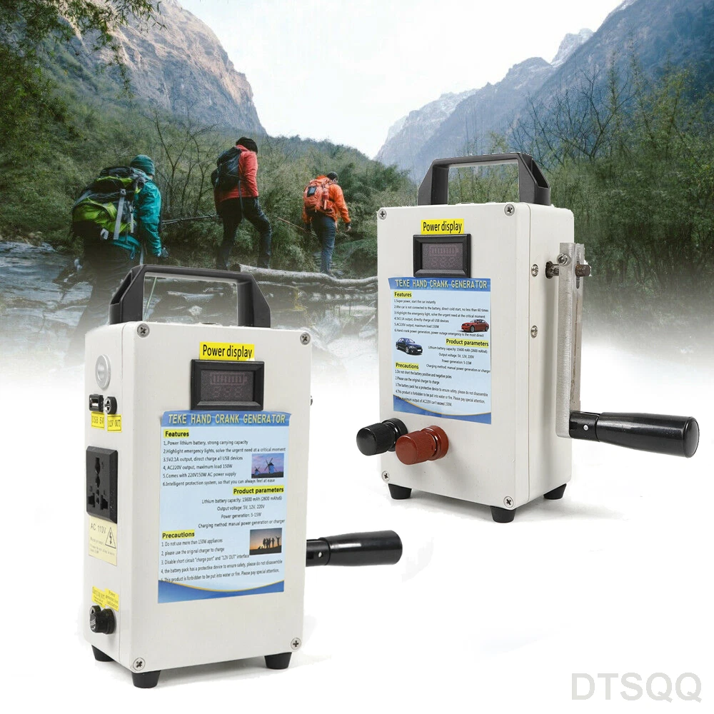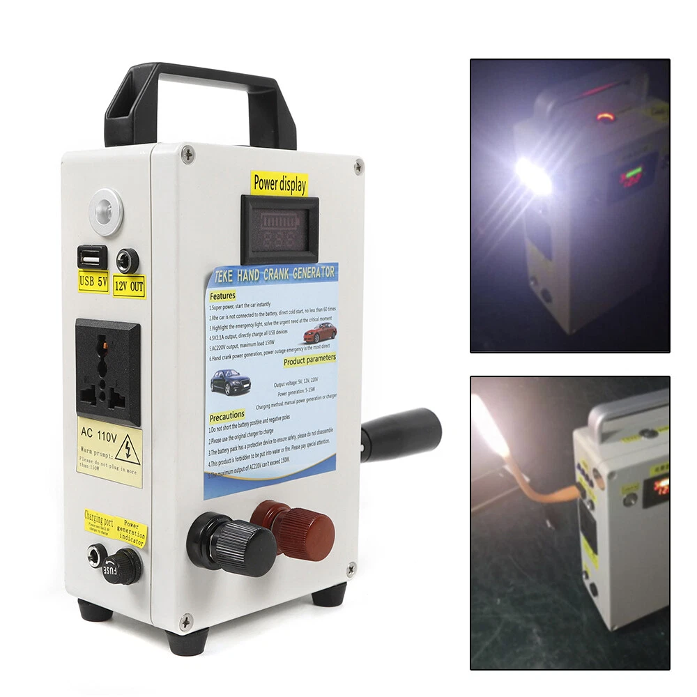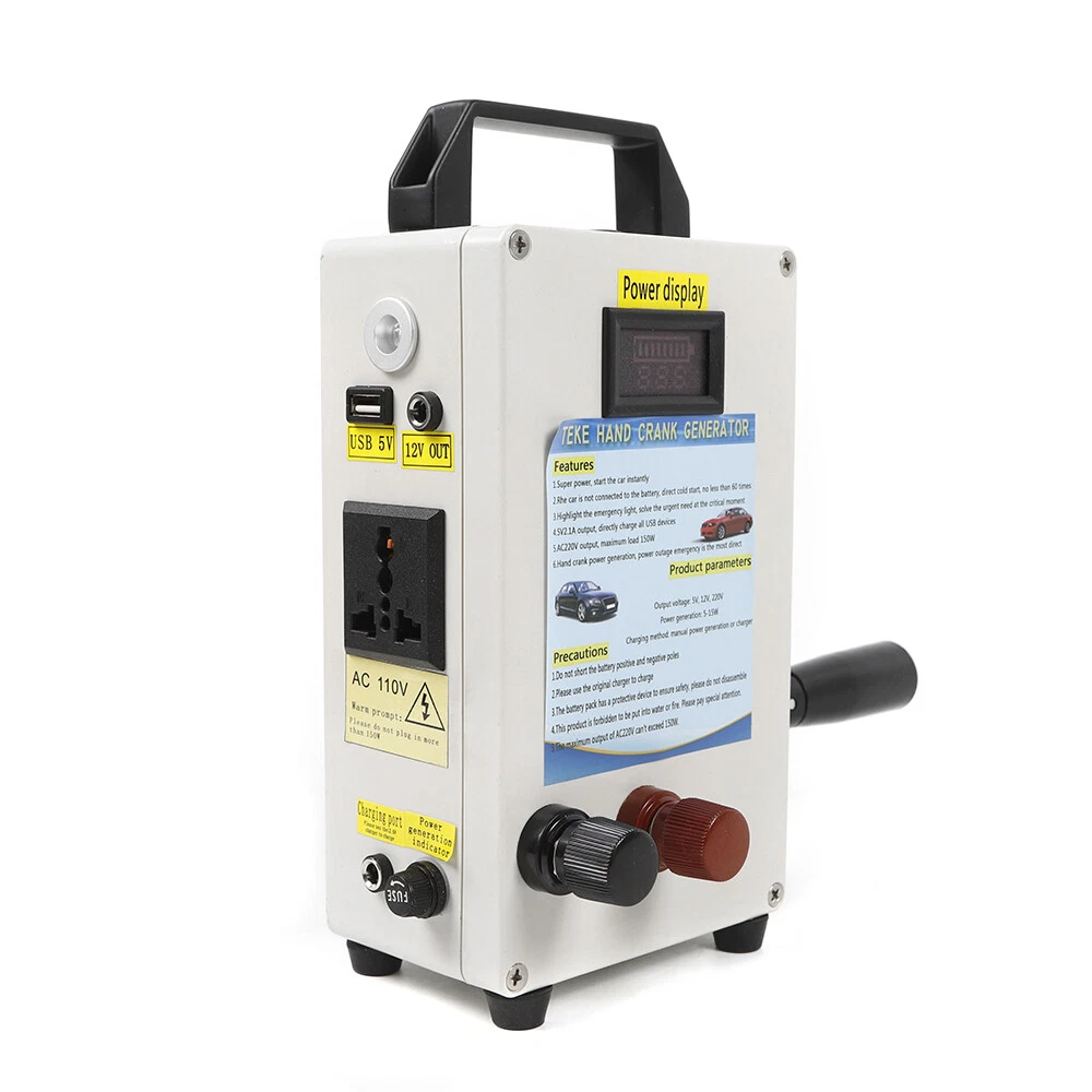 Hand Crank Generator Emergency Power Supply USB Charger Camping Outdoor Survival CE-WMTZXL-785 Hand Crank Generator phone Charger portable Portable Emergency power supply Application: Travel emergency power,Mobile phone charging,Laptop charging,lighting source,electric appliance of 150W,Base station emergency power supply,Outdoor small electric drill power supply Specifications: Item:Emergency hand generator Model: TK150W-C Input voltage: DC11-15V output voltage: USB---5V 2.1A; DC12V; AC110V(sinusoidal wave) Storage method:Municipal power storage (emergency); Hand-operated power generation and storage (15W)---Transmission motor for Speed is slow,The output current is up to 1A Solar energy storage Inverter power:150W Inverter features:Inverter efficiency: 95.4% Product size:200*120*60mm Product weight:1.35KG Hand-operated power generation and storage parameters: 80 round per minute---Motor speed 300 revolutions,output: 12.5V 8.75W 0.7A 90 round per minute---Motor speed 500 revolutions,output: 18.9V, 17.01W 0.9A 130 round per minute---Motor speed 1200 revolutions,output:24.8V ,29.76W 1.2A Features: When hand power is generated, the output indicator is bright, and both positive and negative Product configuration of the power display device can directly s ee the storage voltage and power The handle of the product is made of aluminum alloy, which can be folded and never rusted. Both the input port and the output port are international standard LED indicating lamp,Under - pressure, over pressure, over flow,Over temperature short circuit indication Note: This product is forbidden to be put into water or fire. Please pay special attention. The maximum output of AC220V can't exceed 150W. Packages: 1 x Hand Crank Generator CE-WMTZXL-786 Hand Crank Generator phone Charger portable Portable Emergency Power Supply Application : Travel emergency power , Mobile phone charging , Laptop charging , lighting source , electric appliance of 150W , Base station emergency power supply , Outdoor small electric drill power supply Specifications : Item : Emergency hand generator Input voltage: DC11-15V output voltage : USB---5V 2.1A; DC12V; AC110V(sinusoidal wave) Storage method : Municipal power storage (emergency); Hand-operated power generation and storage (15W)---Transmission motor for Speed is slow , The output current is up to 1A Solar energy storage Charging method: manual power generation or charger Inverter power : 150W Inverter features:Inverter efficiency: 95.4% Built-in insurance:15A×1 low air pressure alarm:10.5±1V Low pressure off:10.5V±1V Over voltage protection:15.6V±1V no-load consumption:12V no-load current :≤0.1A no-load power:<2W peak power : (150W) Product size:200*12*60mm Product weight:1.35KG Hand-operated power generation and storage parameters: 80 round per minute---Motor speed 300 revolutions , output : 12.5V 8.75W 0.7A 90 round per minute---Motor speed 500 revolutions , output : 18.9V , 17.01W 0.9A 130 round per minute---Motor speed 1200 revolutions , output : 24.8V ,29.76W 1.2A Features : When hand power is generated, the output indicator is bright, and both positive and negative Product configuration of the power display device can directly s ee the storage voltage and power The handle of the product is made of aluminum alloy, which can be folded and never rusted. Both the input port and the output port are international standard LED indicating lamp , Under-pressure, over pressure, over flow , Over temperature short circuit indication Super power, start the car instantly T he car is not connected to the battery, direct cold start, no less than 60 times Highlight the emergency light, solve the urgent need at the critical moment 5V , 2.1A output, directly charge all USB devices AC 11 0V output, maximum load 150W Hand crank power generation, power outage emergency is the most direct Note: Do not short the battery positive and negative poles Please use the original charger to charge The battery pack has a protective device to ensure safety, please do not disassemble This product is forbidden to be put into water or fire. Please pay special attention. The maximum output of AC220V can't exceed 150W. Packages: 1 x Hand Crank Generator Payment Delivery details Terms of sales About us Contact us Payment We accept ebay payment 。 Fees such as import duties, taxes are not included in the item price or shipping costs. These charges are the buyer's responsibility. Delivery details Shipping: 2-9 working days to: USA Terms of sales We maintain high standards of excellence and strive for hundred percent customer satisfaction. Feedback is very important to us. We hope that you contact us immediately before you give neutral or negative feedback, so that we can address your concerns. It is impossible to address issues if we do not know about them! About us Your satis faction is our ultimate goal. We work hard to earn your trust and future business. Our certified technicians have tested each item before shipping. The unit comes with 1 year limited warranty on all manufacturing defects. a) If you receive a defective item, you may return it or ask for a discount. Please contact us within 14 days after you receive the package. b) What you returned must be intact and in its original packaging as re? u. Customer is responsible for shipping costs of the returned item. c) We will cover the cost of shipping back t with the shipping rate indicated in the registration page. We will send you a new unit or refund the full payment you paid. Thank you. Contact us Business Hour Business Hour: Monday To Friday: 8:30 AM to 5:00 PM (Beijing China time) Due to time zones, our reply to your questions may not be immediately. But within above working time, we will reply your email within 24 hours. If it's non-workdays, please kindly be patient and wait till Monday. Please contact us with ebay message. Please feel free to contact us if you have any questions. Monday To Friday: 8:30 AM to 5:00 PM (Beijing China time) Due