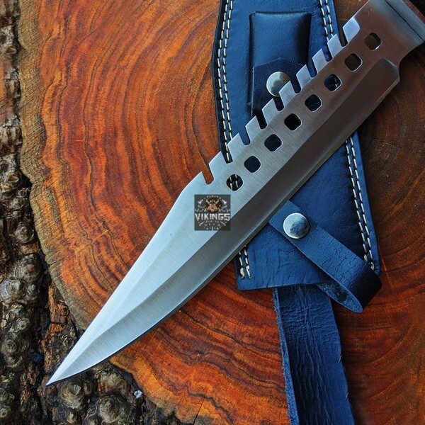 Tactical Survival Bowie Knife – Sawback Spine & Black Handle Prepare for any challenge with this rugged and stylish Tactical Survival Bowie Knife. Crafted for durability and functionality, this knife features a full-tang stainless steel blade with a razor-sharp edge and a unique sawback spine. The sawback design not only adds a fierce aesthetic but also provides practical cutting power for wood, rope, and more. The spine is perforated with a row of ventilation holes, reducing weight while enhancing the blade's tactical look. The ergonomic black G10 handle ensures a secure, non-slip grip even in wet or muddy conditions. A double-sided guard adds extra hand protection, making this an ideal choice for hunters, adventurers, and survivalists. Specifications : Overall Length: Approx. 15 inches Blade Length: Approx. 10 inches Blade Material: Carbon Steel with Sawback Spine Handle Material: Textured Black Design Features: Full-tang, sawback spine, ventilation holes, protective guard Perfect for outdoor expeditions, collectors, or as a gift for blade enthusiasts, this Bowie knife is a reliable companion for any adventure. SHIPPING We use DHL or UPS normally. 5-7 Business days delivery and trackable easily. International shipping custom duty is paid by the customer, we are not responsible for the custom duties applied by your countries rules and regulations. For more queries contact us Customization Available Quality is Assure We deliver through DHL Please check Dhl Coverage area before placing order if your Address fall in DHL remote Area List You will have to pay $50 or change your Address Your satisfaction is very important for us if you have any issue contact us first before leaving any bad Review your issue will be resolved more efficiently ASAP Vikings Armory