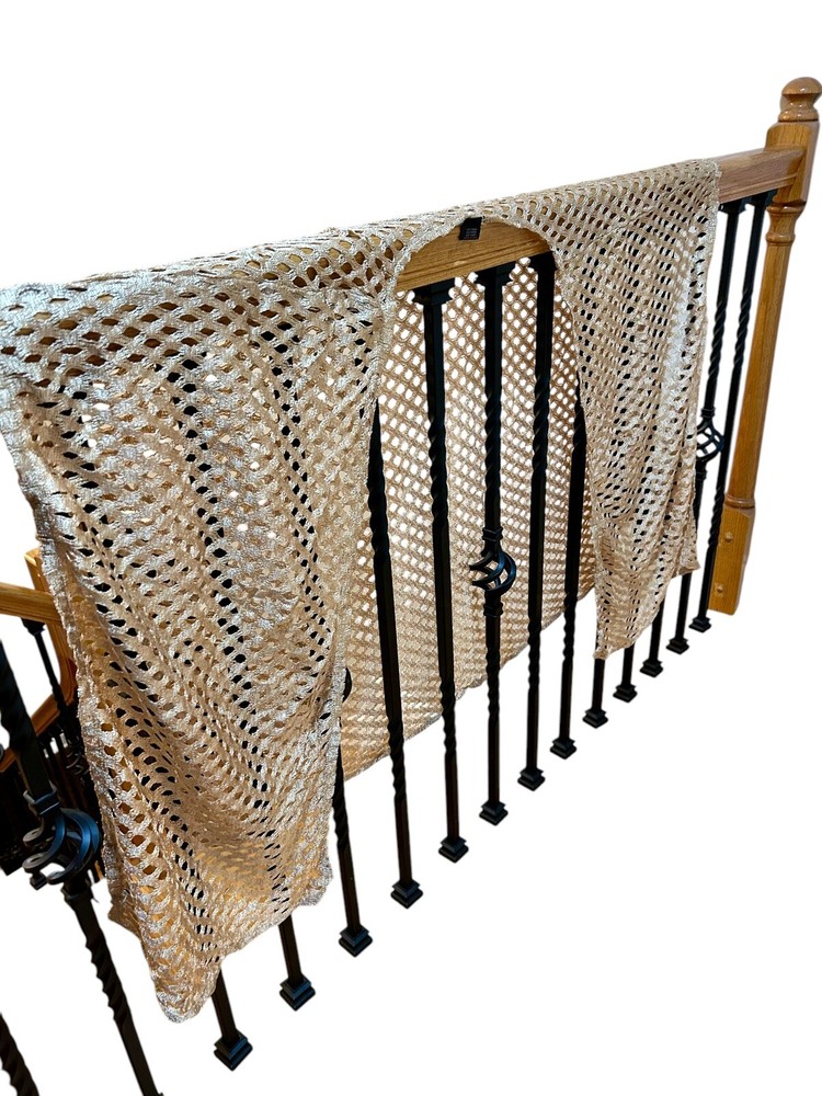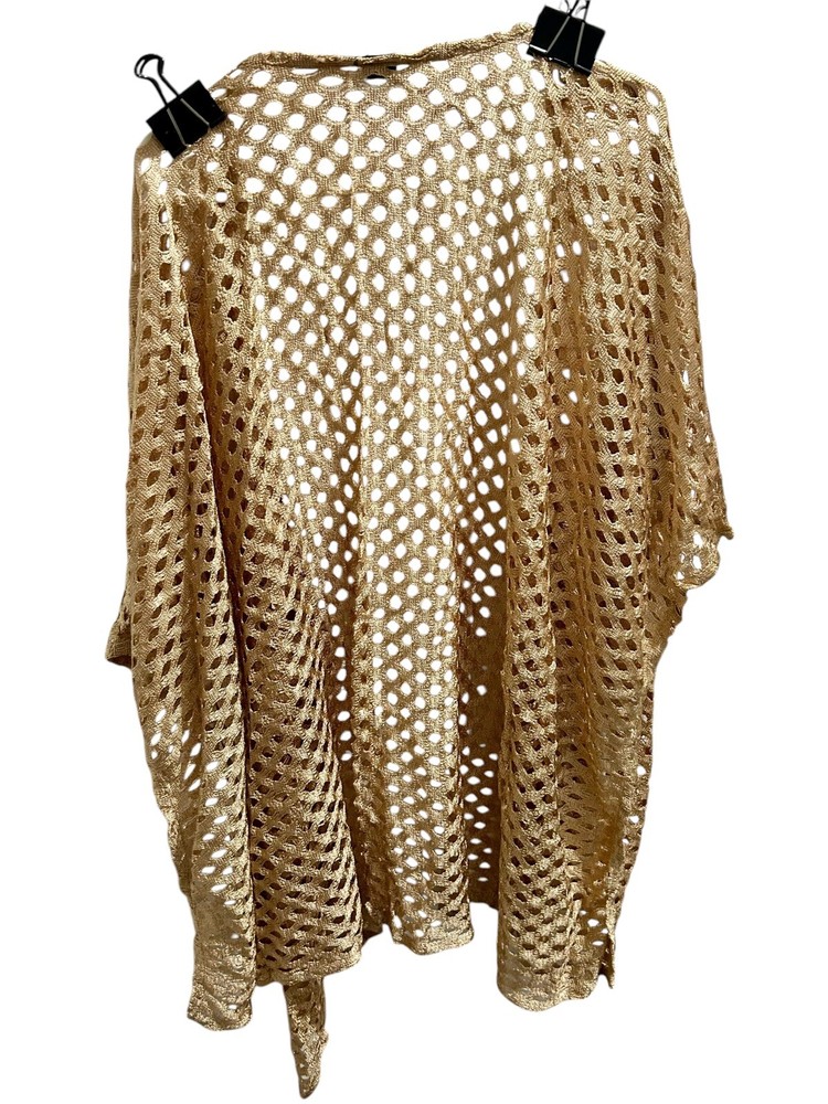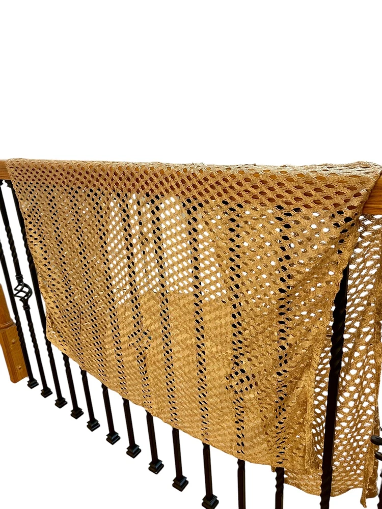 This open front knit crochet wrap shawl in golden tan is an open square scarf that features a boho, hippie, retro, and beach-themed design. It is made of rayon fabric, with accents of crochet detailing. This multifunctional shawl/wrap could also be worn as a beach cover up.