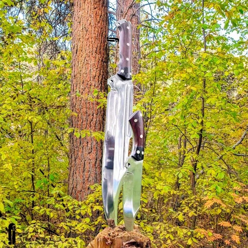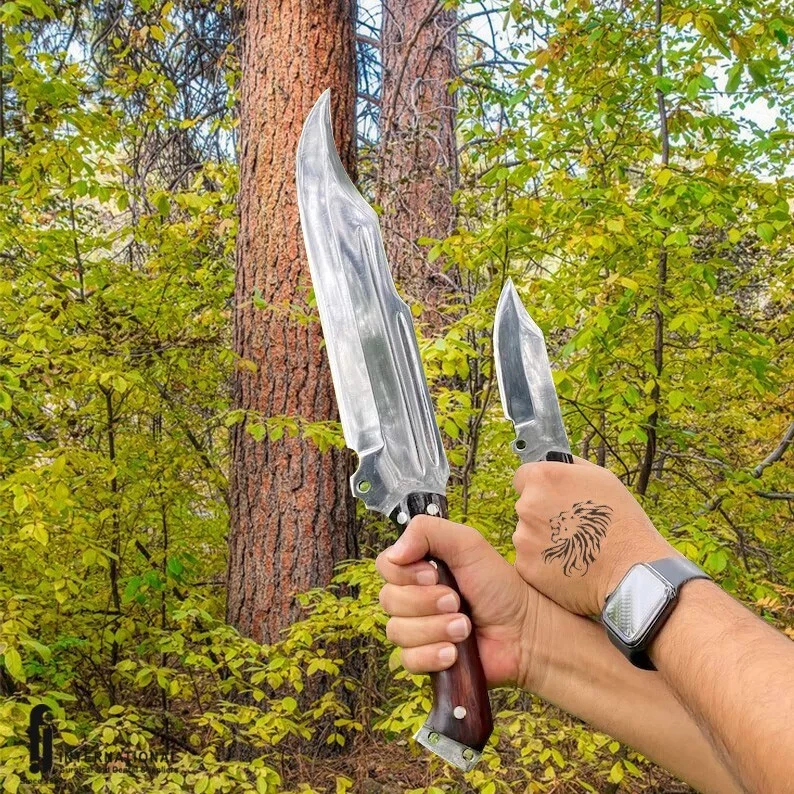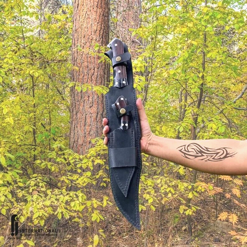 Handmade Survival Bowie Knife Main Blade Specifications: Materials: High graded carbon steel, leather, wood, brass Construction: Hand forged for durability and strength Blade: 13 inches, crafted from 5160 leaf spring from a truck Handle: 6 inches, full tang, made of rosewood, with bone accents Weight: Blade weighs 940 grams; final weight is 1650 grams Scabbard: Made of high-quality leather, ensuring protection and ease of carry Additional Features: Sharpened and ready to use, comes with a 100% warranty Supporting Blade Specifications: Blade: 4 inches, perfect for intricate tasks Handle: 5 inches, full tang Weight: 230 grams This knife set is ideal for survival enthusiasts, providing both a robust main blade and a precise supporting blade for various tasks. The craftsmanship and quality materials ensure reliability and longevity in any situation. Safety Precautions for Your Handmade Survival Bowie Knife Handling: Always handle the knife with care. Hold it firmly, and make sure your hands are dry to avoid slipping. Use the knife only for its intended purposes. Cutting Direction: Always cut away from your body and keep your fingers clear of the blade to prevent accidental injuries. Storage: Store the knife in its leather scabbard when not in use. Keep it out of reach of children and away from places where it can accidentally fall or be accessed by unauthorized individuals. Transport: When transporting the knife, ensure it is securely sheathed and fastened to prevent it from slipping out or getting damaged. Do not carry the knife loosely in your pocket or bag. Environment: Be mindful of your surroundings when using the knife. Avoid using it in crowded or unstable environments where accidental slips could cause harm. Maintenance: Regularly inspect the knife for any signs of damage, such as cracks or chips in the blade or handle. Do not use the knife if it shows signs of damage, and get it repaired by a professional. Sharpening: Exercise caution when sharpening the blade. Use a proper sharpening tool and follow safety guidelines to avoid accidents. Training: If you are not experienced in using knives, seek proper training or practice safe handling techniques before using the knife in critical situations. Emergency: Keep a first aid kit nearby when using the knife, especially during outdoor activities. In case of an injury, seek immediate medical attention. By following these safety precautions, you can enjoy using your handmade survival bowie knife safely and effectively. Stay safe and happy adventuring!