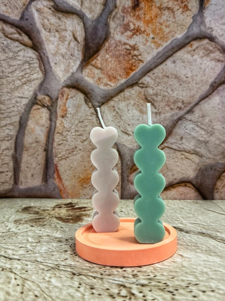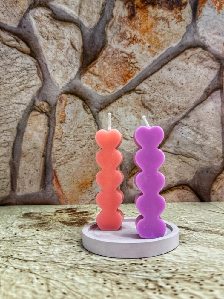 The candle is heart-shaped, small, multicolored, and made of soy wax. It is scented with vanilla and has a modern style. It is 4 inches in length, 4 inches in height, and 1 inch in width. It weighs 5 ounces and has a burning time of 1-2 hours. This handmade decorative candle comes in a set of 2 and is suitable for various rooms like the entryway, bedroom, living room, and dining room.