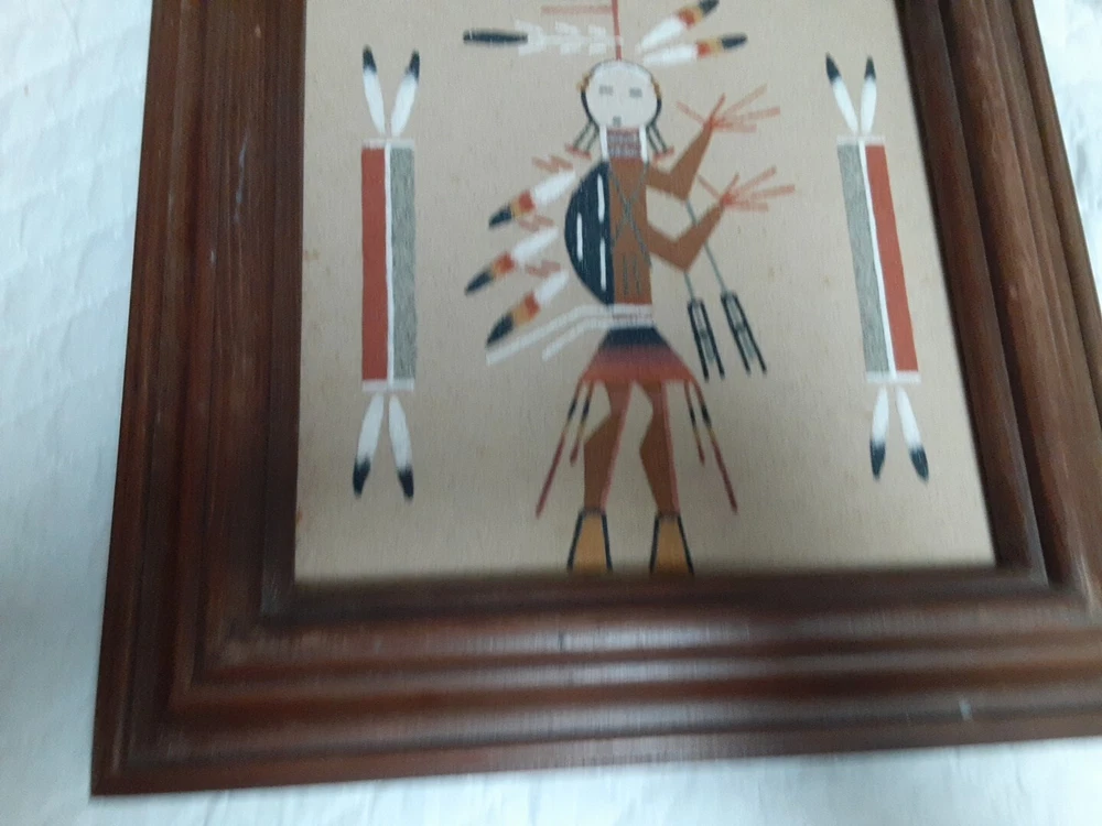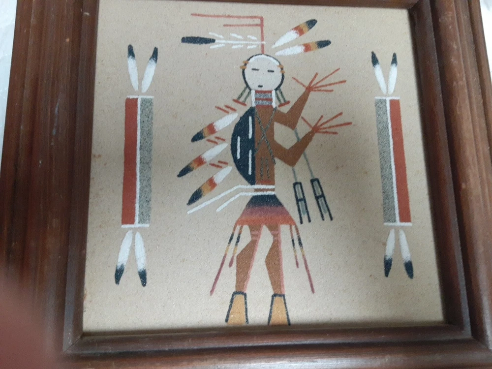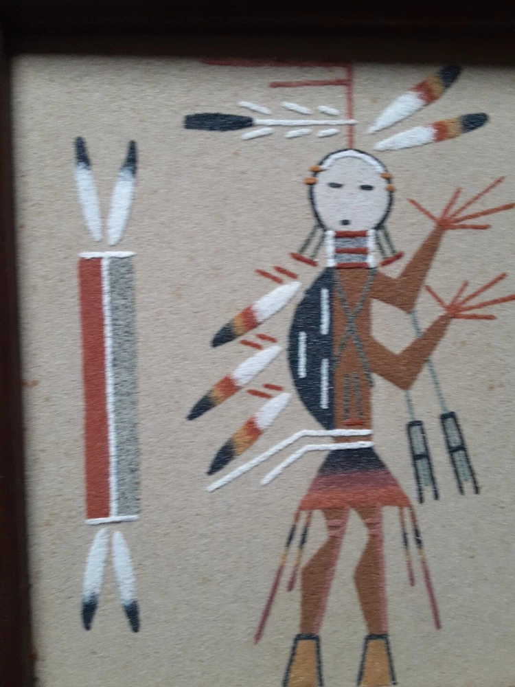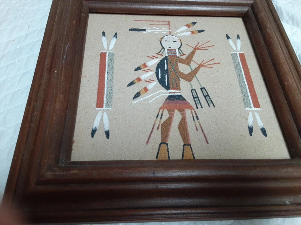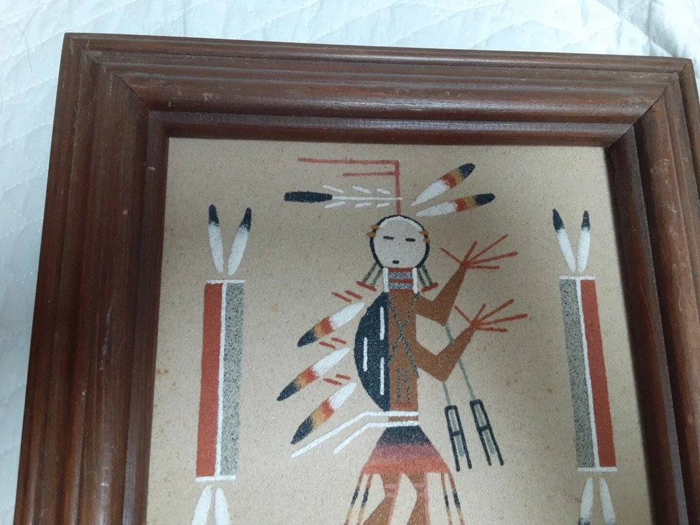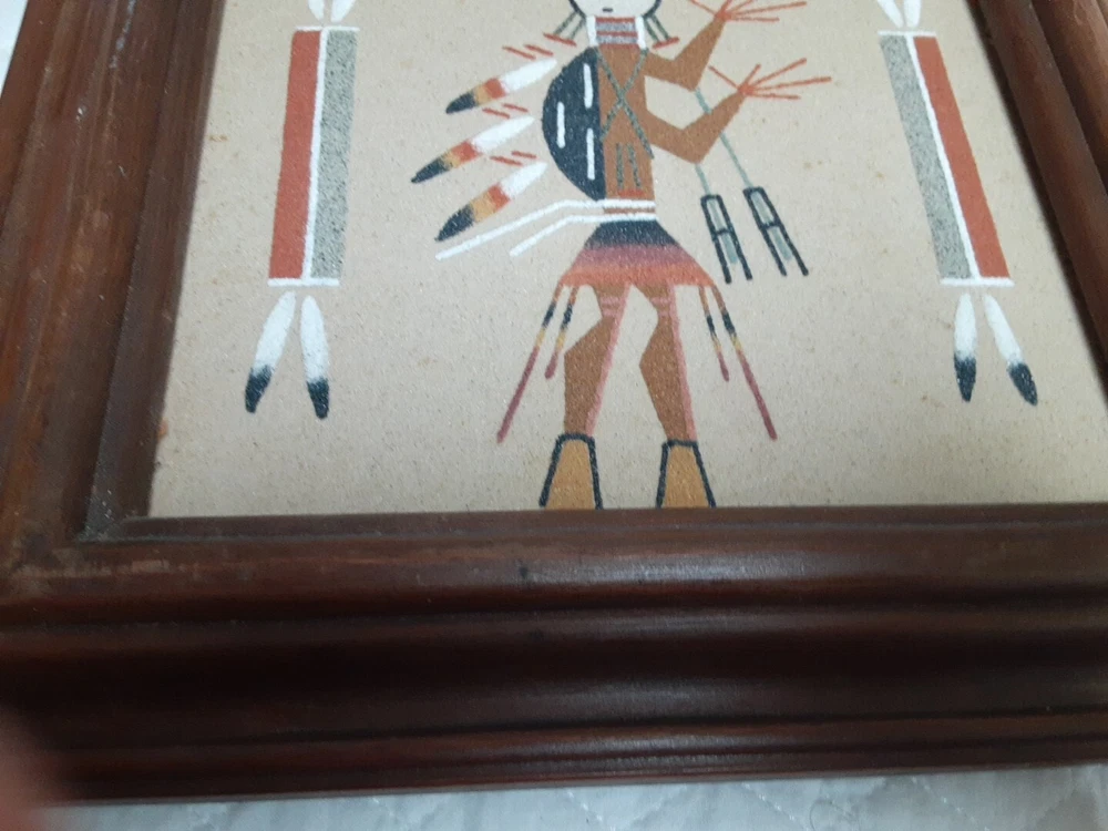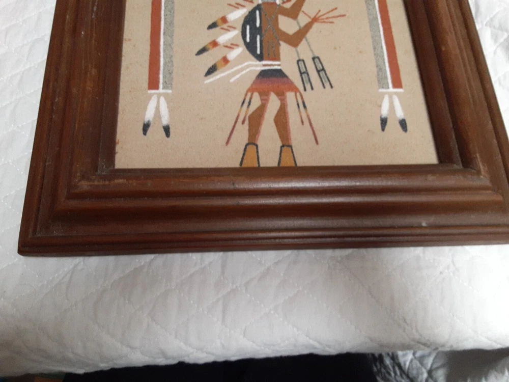 Hand Made South Western Sand Art Figure in Wood Frame Framed needs staple together. Very good condition. signed by Lester Jordan