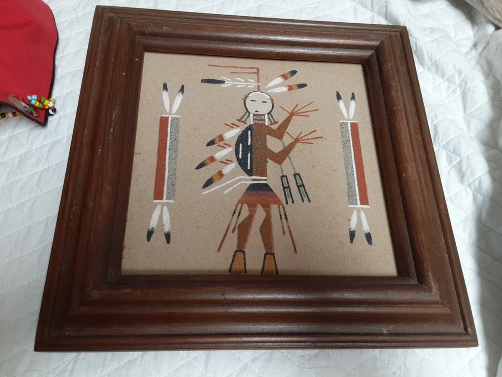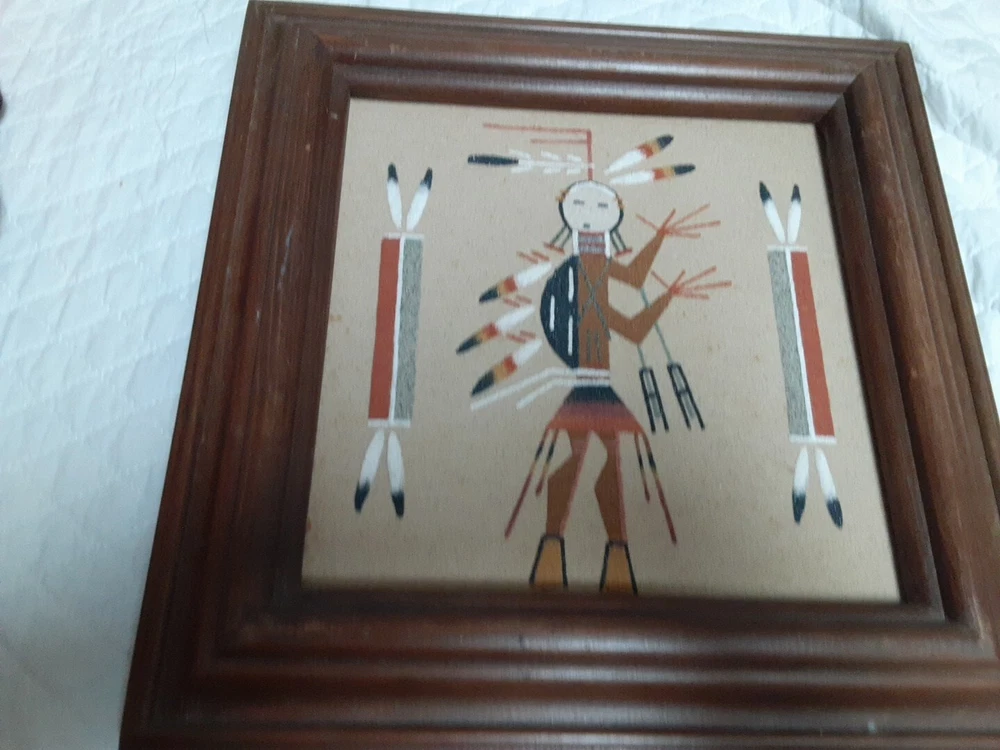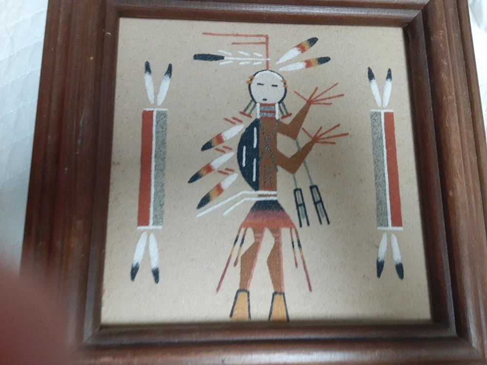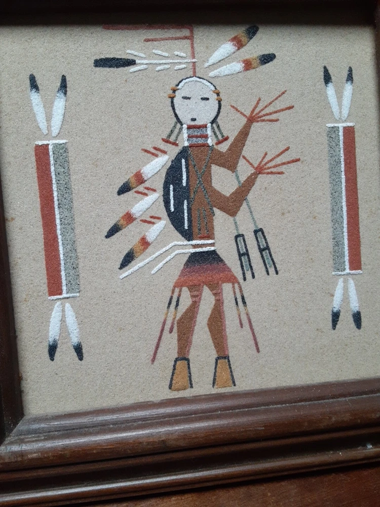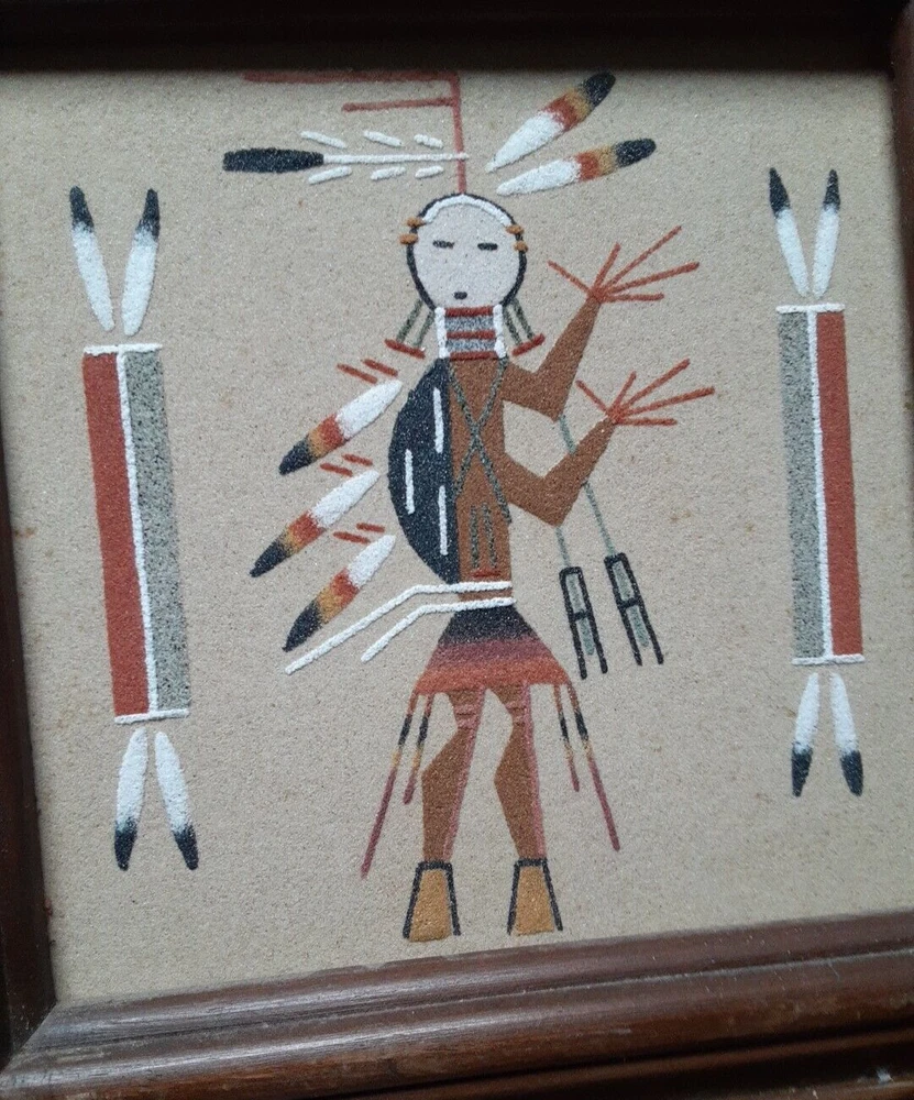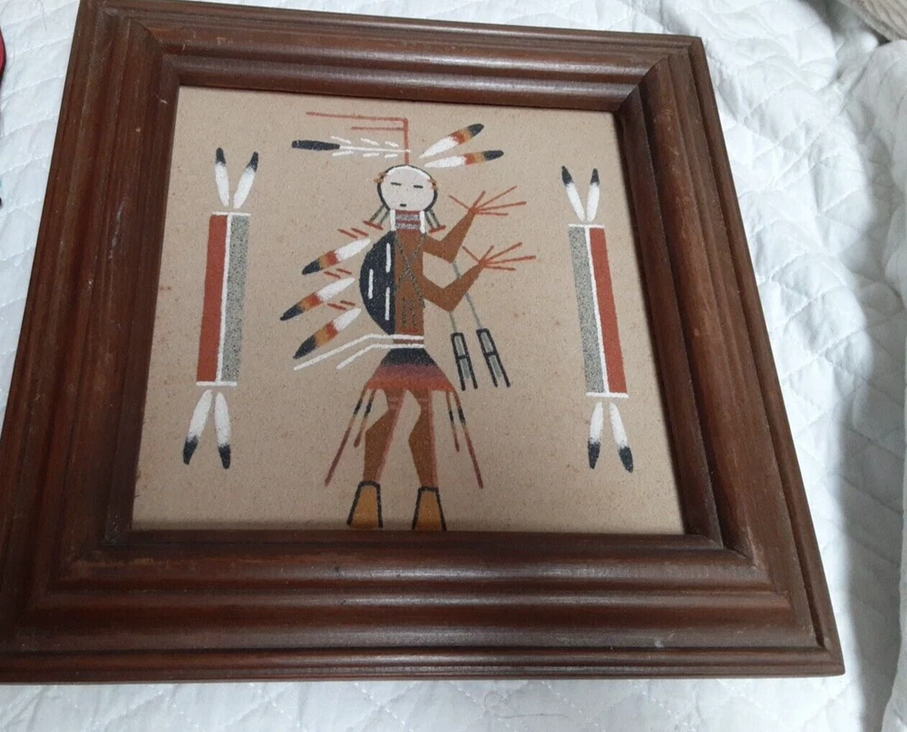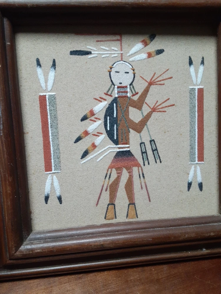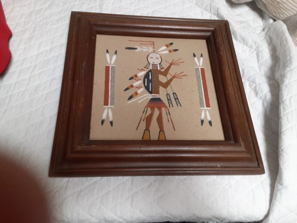 Hand Made South Western Sand Art Figure in Wood Frame Framed needs staple together. Very good condition. signed by Lester Jordan